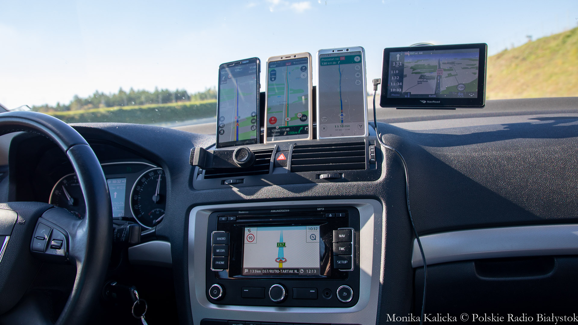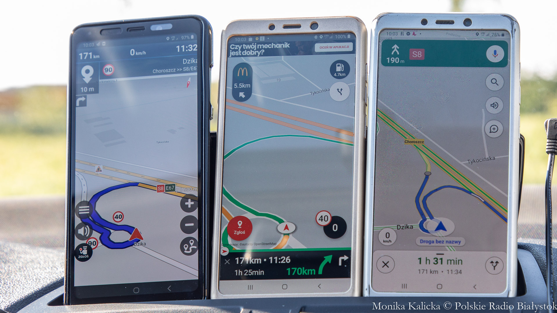Sześć różnych map (m.in. z komputera pokładowego auta służbowego, z urządzenia nawigującego i aplikacji różnych producentów) ustawione w punkcie startu (Węzeł Choroszcz) na ten sam punkt docelowy (ul. Toruńska w Warszawie) wskazywały długość trasy różniącą się nawet o 10 km, a czas dojazdu wg skrajnych wskazań urządzeń różnił się aż o 50 minut.