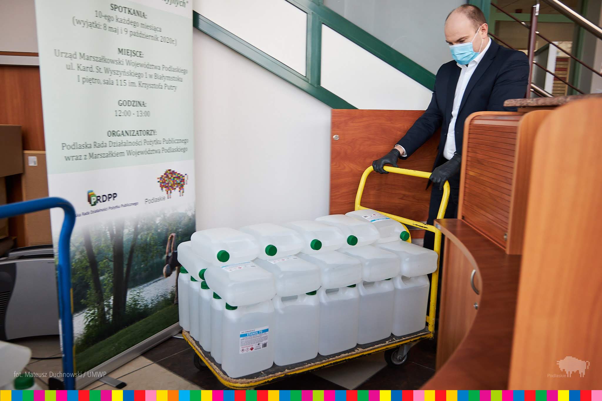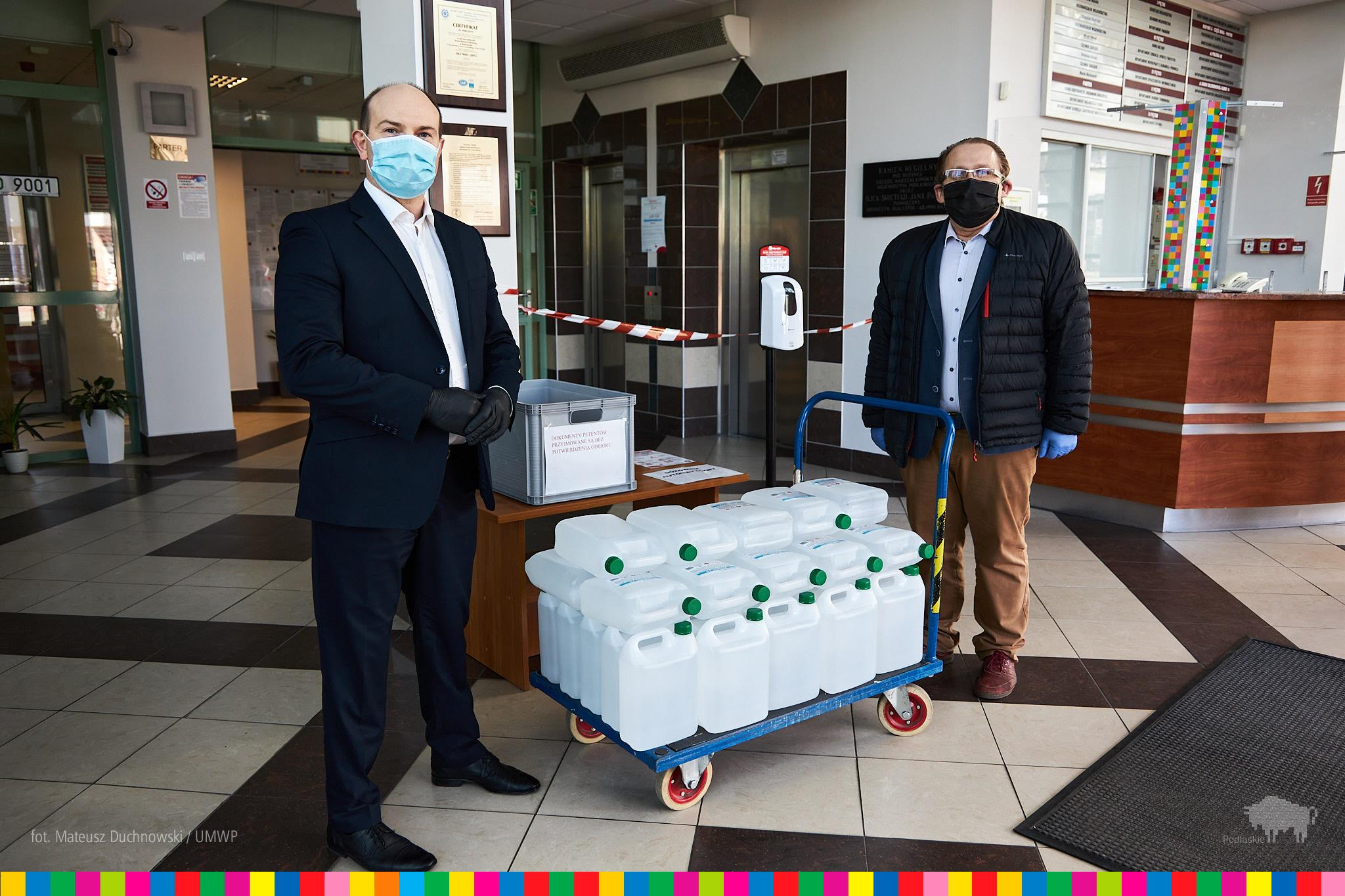 Kupił je samorząd województwa podlaskiego. Środki dezynfekujące przekazał marszałek Artur Kosicki.