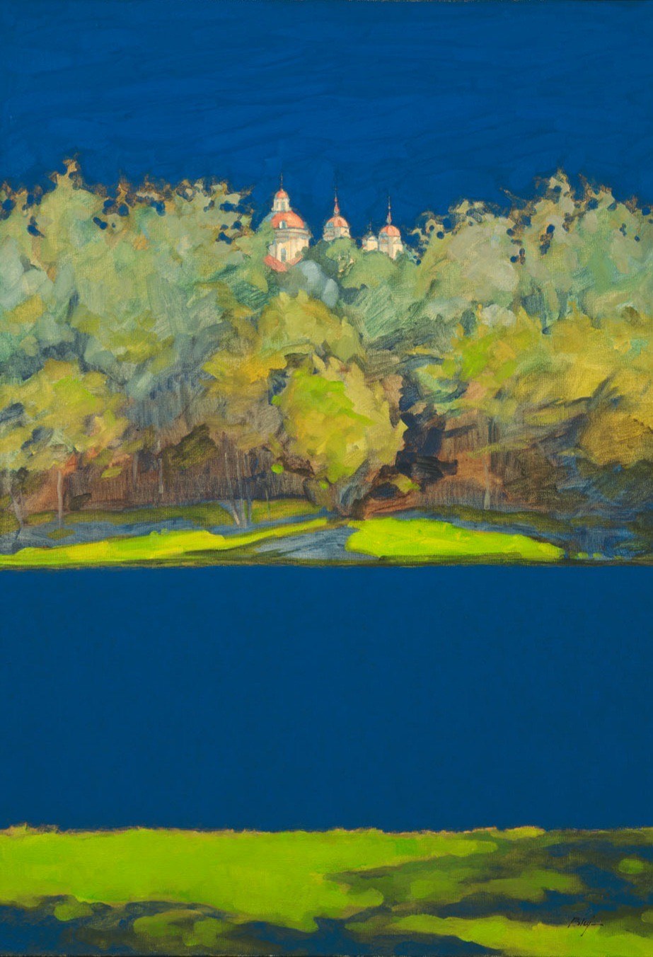 Widok na kościół Piotra i Pawła z prawego brzegu Wilii, Robert Bluj, 2015 rok technika olejno woskowa na płótnie lnianym 100x70cm, Archiwum prywatne