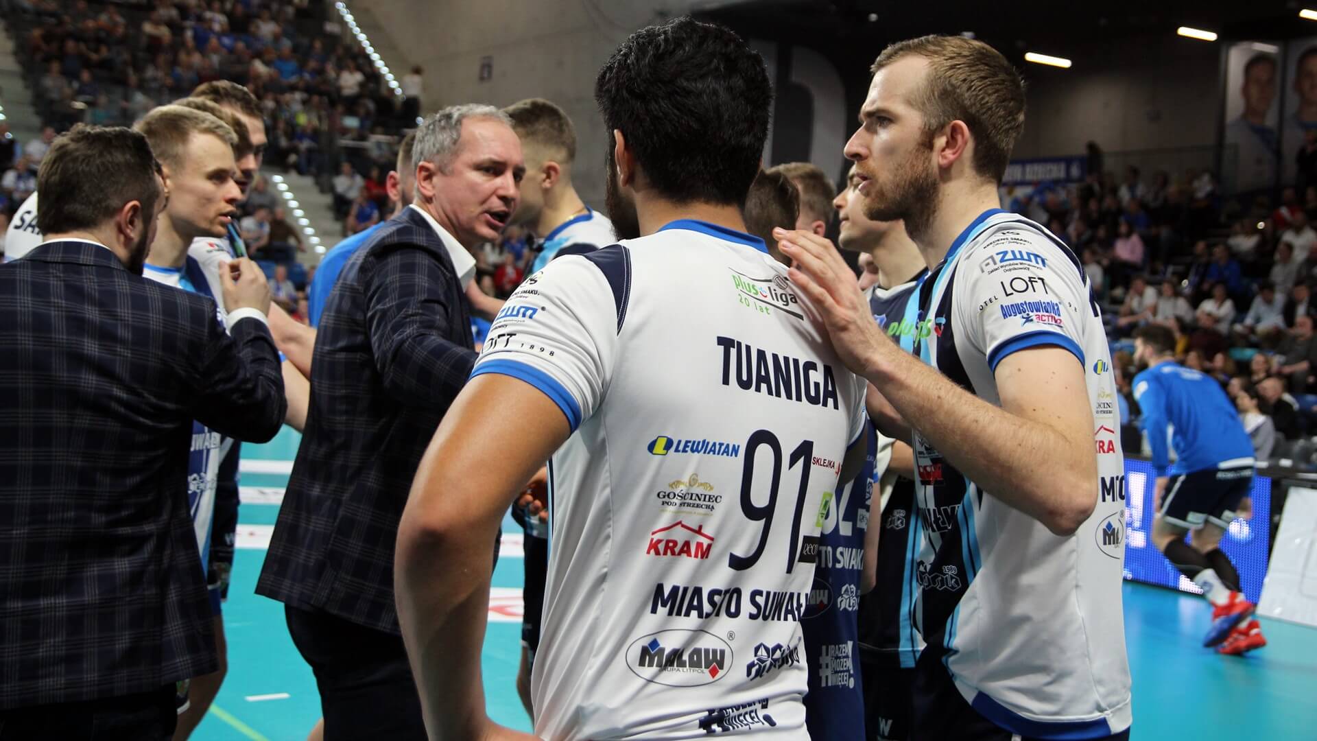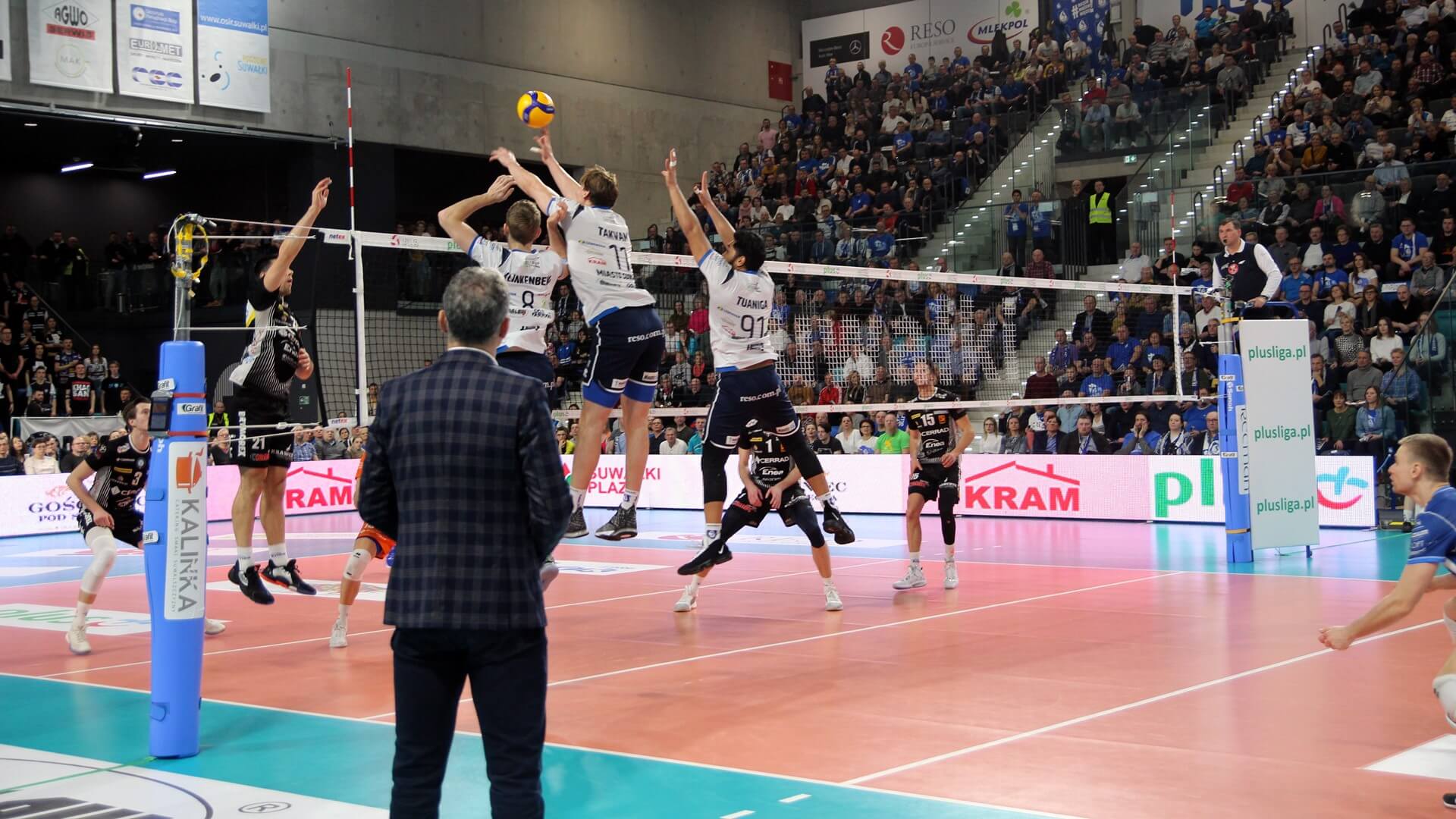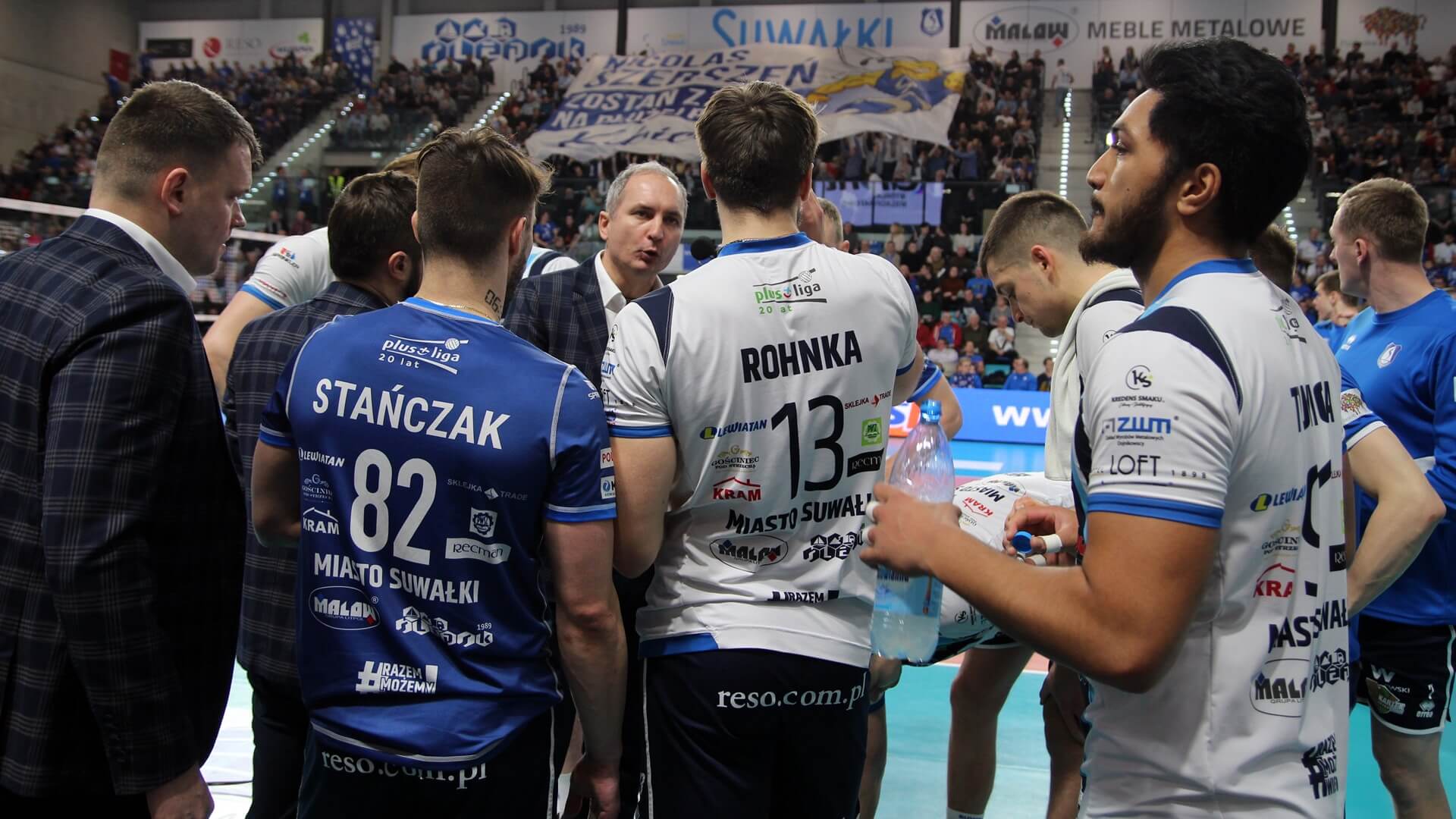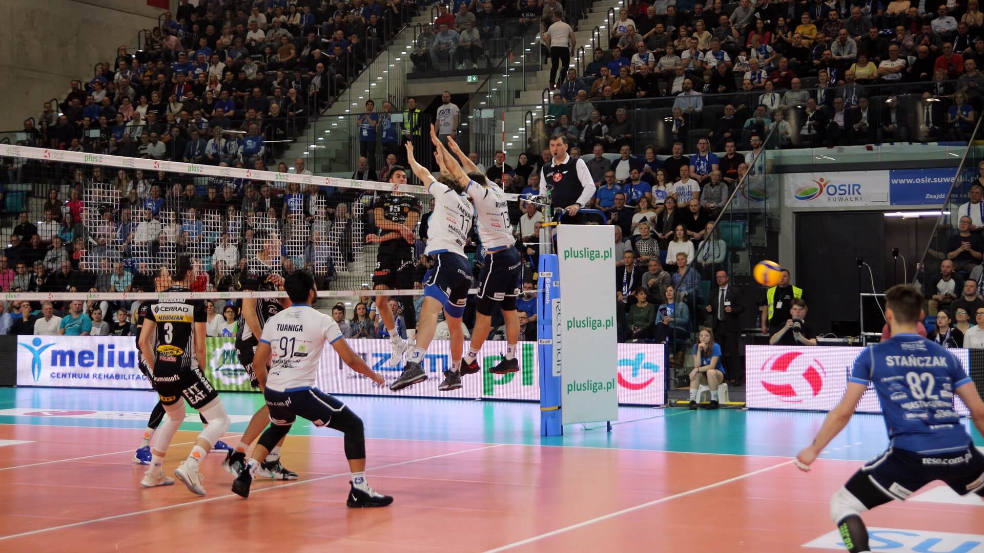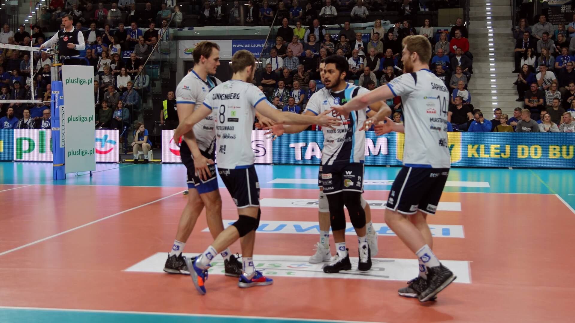 Ślepsk Malow Suwałki wychodzi w składzie: Nicolas Szerszeń, Bartłomiej Bołądź, Joshua Tuaniga, Andreas Takvam, Jakub Rohnka, Cezary Sapiński, na libero Paweł Filipowicz i Adrian Stańczak.