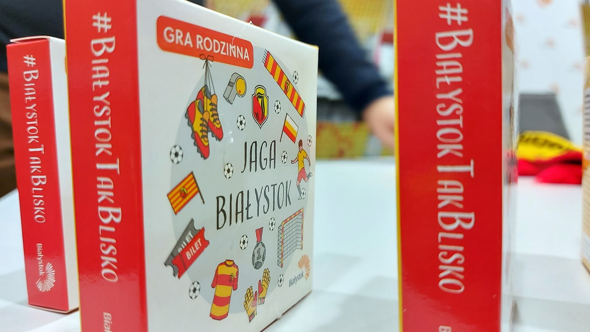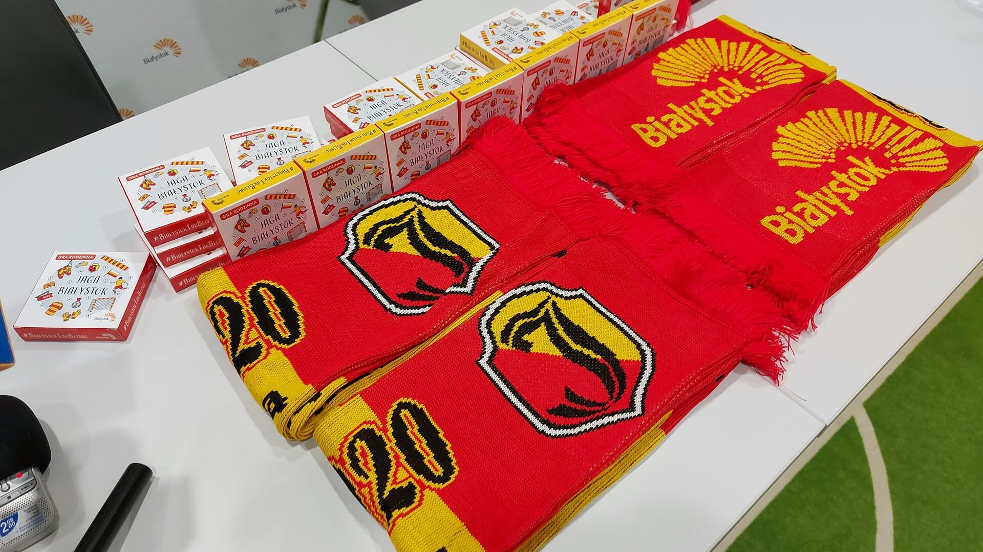 Dla kibiców przygotowano grę rodzinną "Jaga Białystok" i żółto-czerwony szalik z hasłem "Miasto Białystok z Jagiellonią".