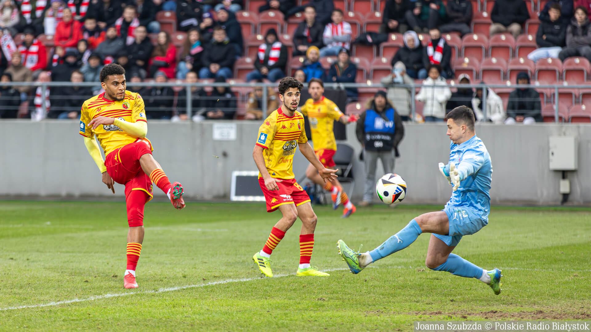 Żółto-czerwoni objęli prowadzenie w 34. minucie. Doskonale w akcji ofensywnej spisał się Norbert Wojtuszek, który na piątym metrze dograł piłkę do Fadigi, który strzelił w słupek, a celną dobitką popisał się Darko Churlinov.