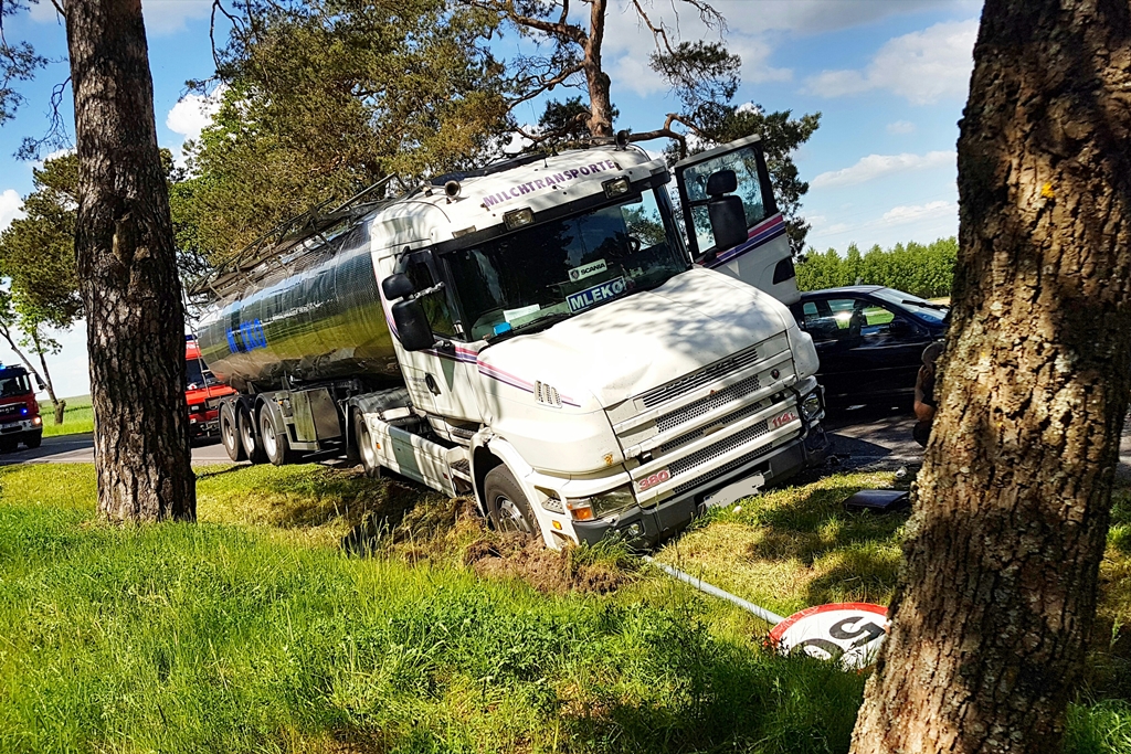 Częściowo zablokowana była droga krajowa nr 63 na odcinku Łomża - Zambrów. Za miejscowością Podgórze zderzyły się trzy samochody: dwa osobowe i cysterna przewożąca mleko.