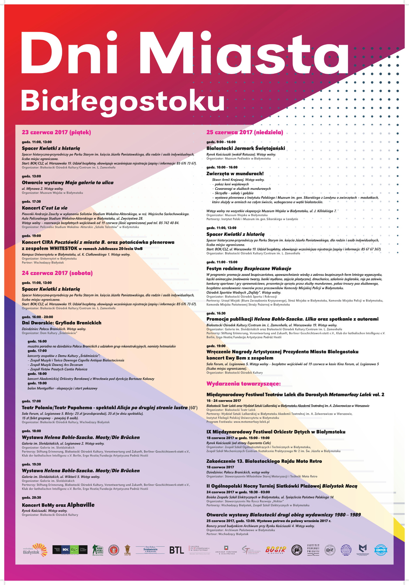 Ostatni dzień (25.06) to czas, kiedy białostoczanie mogą wybrać się m.in. na Jarmark Świętojański na Rynku Kościuszki czy festyn rodzinny "Bezpieczne Wakacje" na Dojlidach. W czasie wydarzenia "Zwierzęta w mundurach" obejrzą pokaz koni wojskowych i psów w służbach mundurowych.