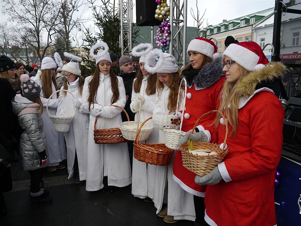 Jasełka, kolędy i dzielenie się opłatkiem - to część programu miejskiej wigilii w Łapach. Na Placu Niepodległości, mieszkańców - do wspólnego śpiewania kolęd zachęcli dzieci i młodzież z ogniska muzycznego oraz chórzyści.