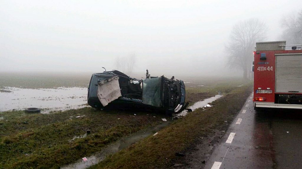 Ze wstępnych ustaleń policji wynika, że kierowca samochodu osobowego wyprzedzał inną osobówkę, wówczas kierowca jadącej z naprzeciwka ciężarówki - chcąc uniknąć zderzenia - skręcił w prawo, zjechał na pobocze, a TiR przewrócił się i wpadł do rowu. Na auto osobowe najechało jeszcze inne auto. Dwie osoby - kierowcę ciężarówki i jednej z osobówek - przewieziono do szpitala.