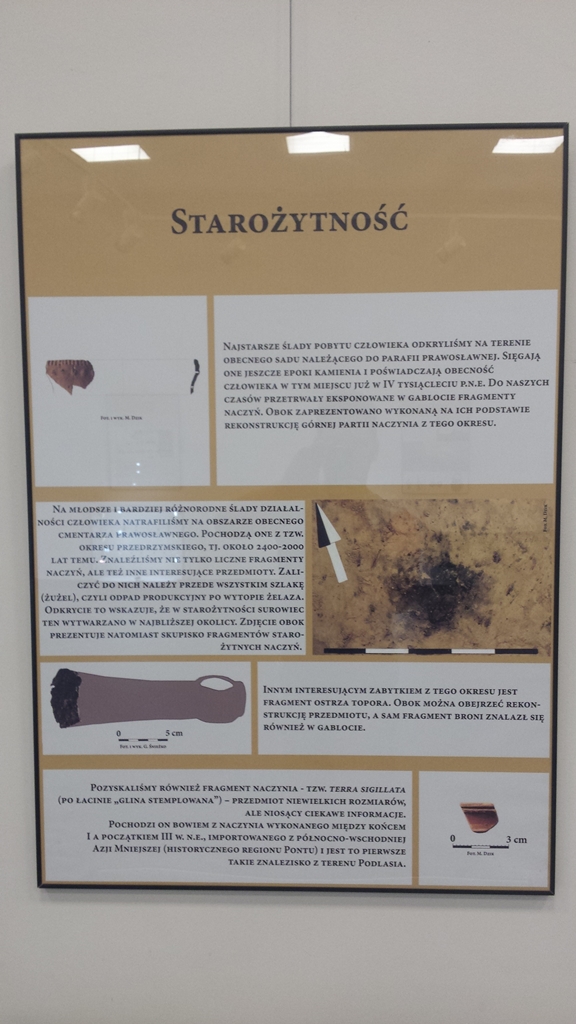 Eksponaty wykopano na cmentarzu prawosławnym oraz z terenów dawnego rynku miejskiego. Wśród nich także monety, najstarsze z przełomu piętnastego i szesnastego wieku.