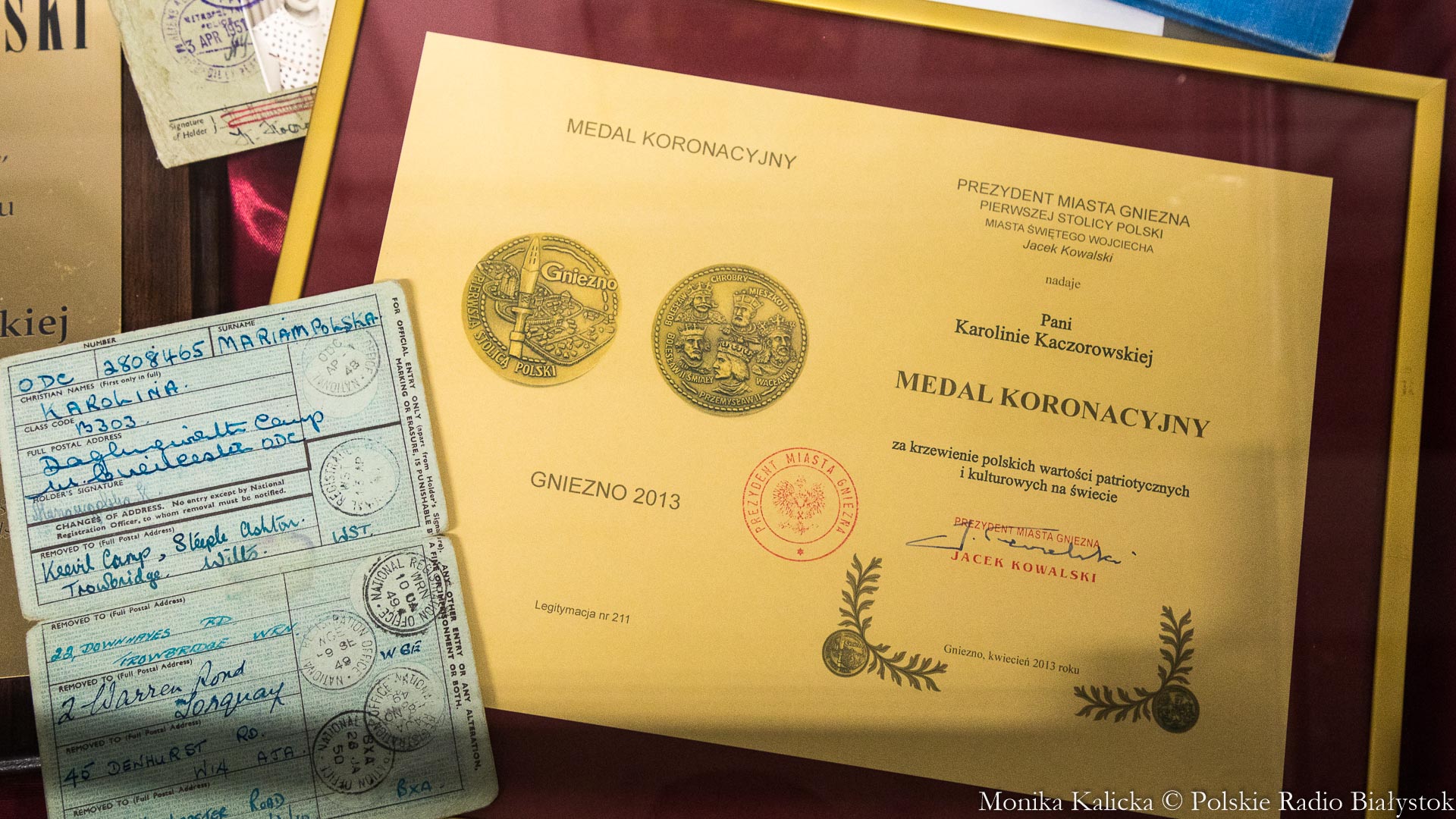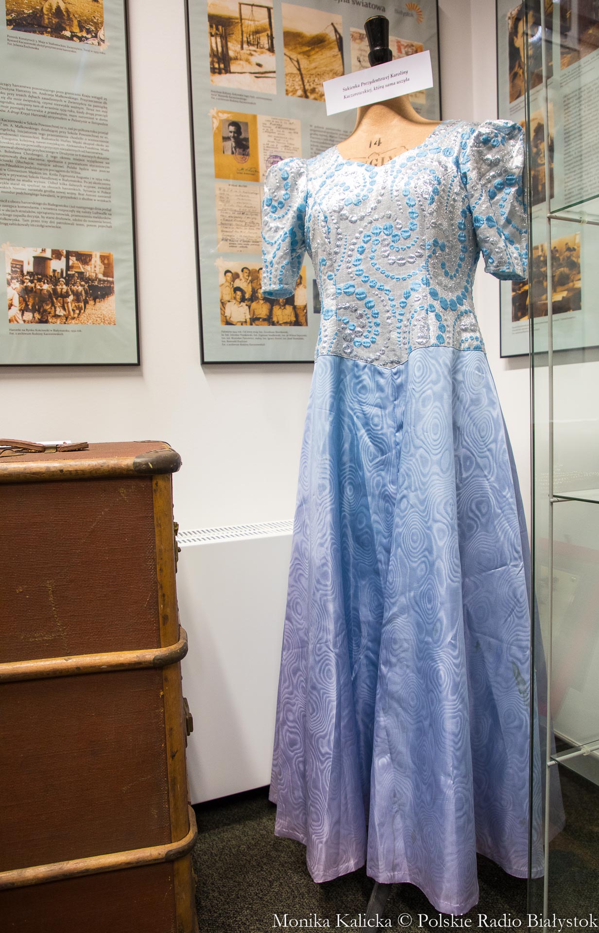 Oprócz biografii Kaczorowskiej pokazywane są - jak mówił Dobroński - wyjątkowe pamiątki, m.in. kufer podróżny, z którą pani Karolina przebyła długą drogę z Afryki do Anglii. To też sukienka, którą pani prezydentowa sama uszyła, a pochodzi z lat 40. ubiegłego wieku. W gablotach można zobaczyć również dokumenty, medale i odznaczenia, jak Krzyż Komandorski Orderu Odrodzenia Polski.