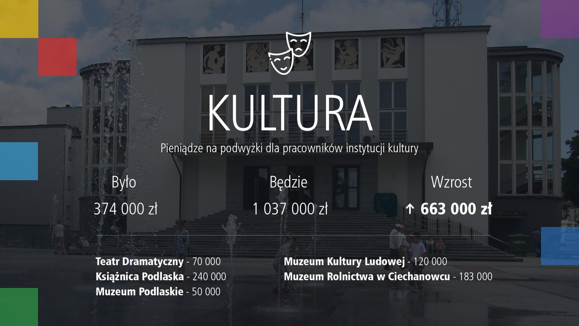 Jeszcze na sesji marszałek Kosicki powtarzał, że o ponad 660 tys. zł zwiększono pieniądze na kulturę, głównie na podwyżki dla pracowników, 300 tys. zł dodatkowych środków przyznano także Operze i Filharmonii Podlaskiej na premiery bajek, a o 450 tys. zł więcej będzie na ochronę zabytków. Do ochrony zdrowia dołożono 12 mln zł, o 9 mln zł więcej przeznaczono na drogi.