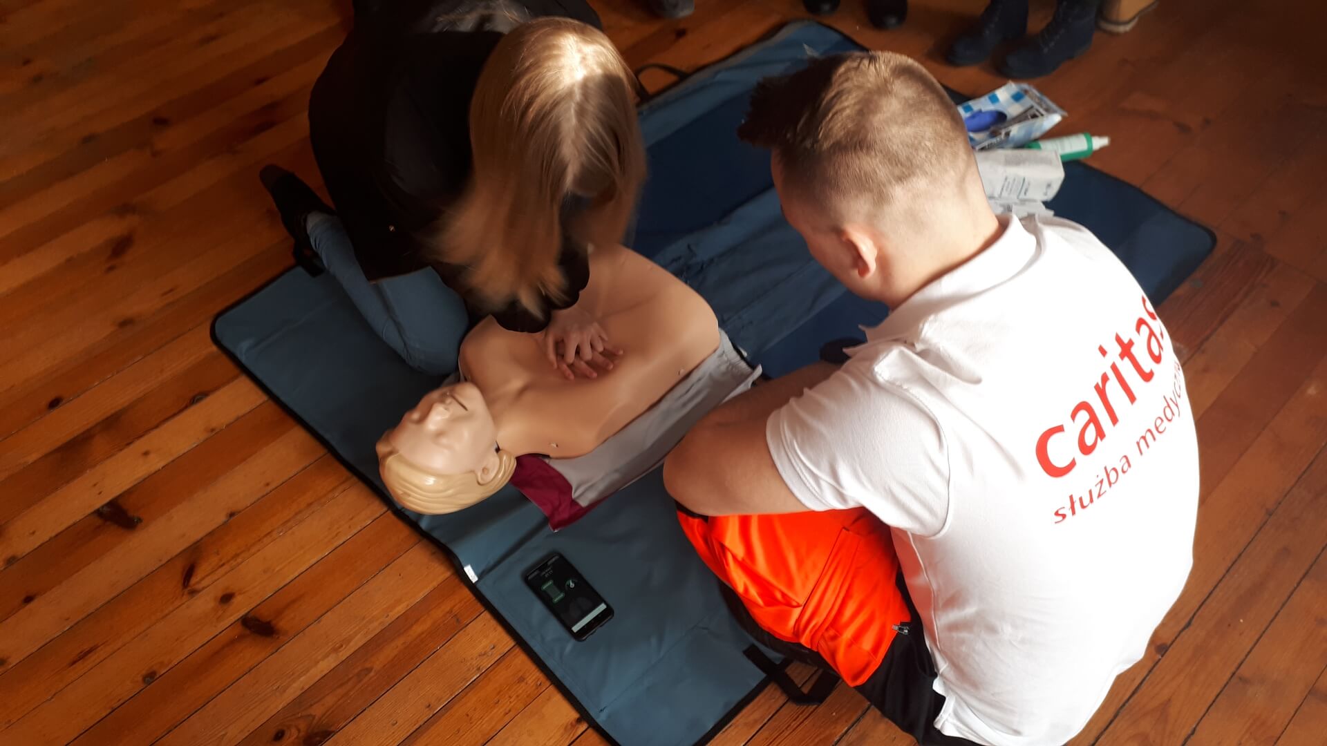 W sobotnim kursie wzięła udział młodzież z pobliskiego gimnazjum. Na specjalnych fantomach młodzi ludzie uczyli się m.in., jak działają defibrylatory, jak ocenić stan poszkodowanego, jak robić masaż serca, na co zwrócić uwagę, a czego robić nie wolno.