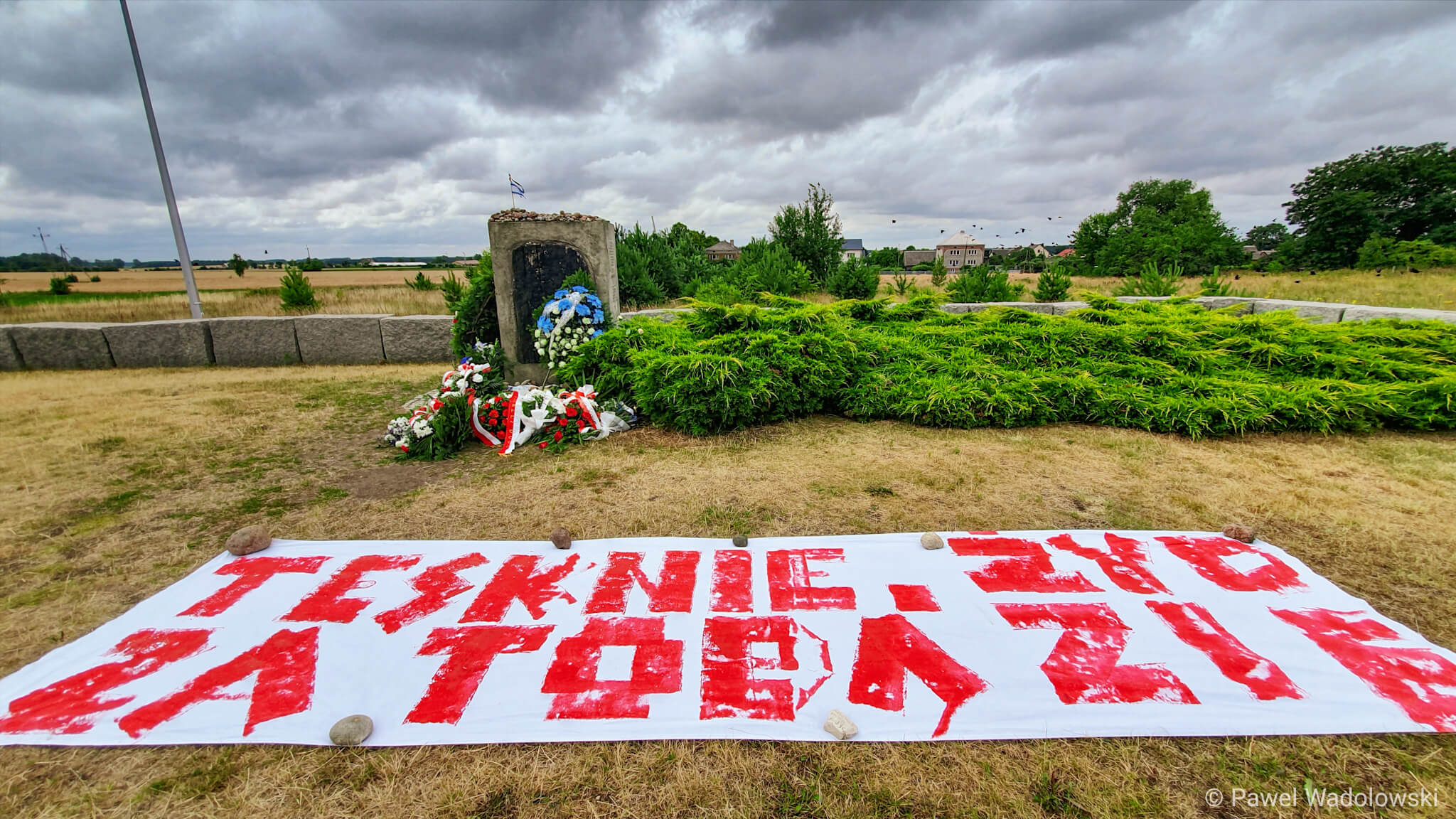 Podobny, ale już na płachcie materiału, położony jest przy pomniku upamiętniającym zbrodnię sprzed 78 lat. Policjanci ustalają, kto jest autorem tych napisów.