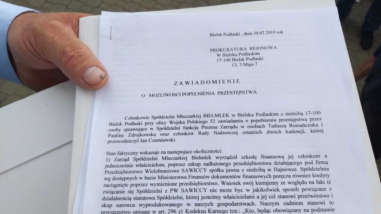 Grupa rolników postanowiła zawiadomić prokuraturę w sprawie możliwości popełnienia przestępstw przez zarządzających spółdzielnią. W piśmie do organów ścigania piszą między innymi, że Zarząd Spółdzielni wyrządził szkodę finansową jej członkom poprzez zakup zadłużonego przedsiębiorstwa z Hajnówki - niezwiązanego z branżą mleczarską, tylko między innymi ze stolarską. Dodatkowo Bielmlek temu przedsiębiorstwu poręczał kredyty. Dodatkowo rolnicy zarzucają władzom spółdzielni prowadzenie tzw. kreatywnej księgowości w celu zafałszowania faktycznego stanu Spółdzielni. Autorzy pisma do prokuratury stawiają jeszcze kilka innych zarzutów.