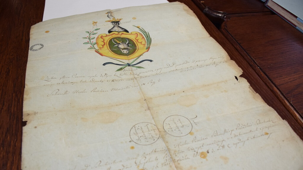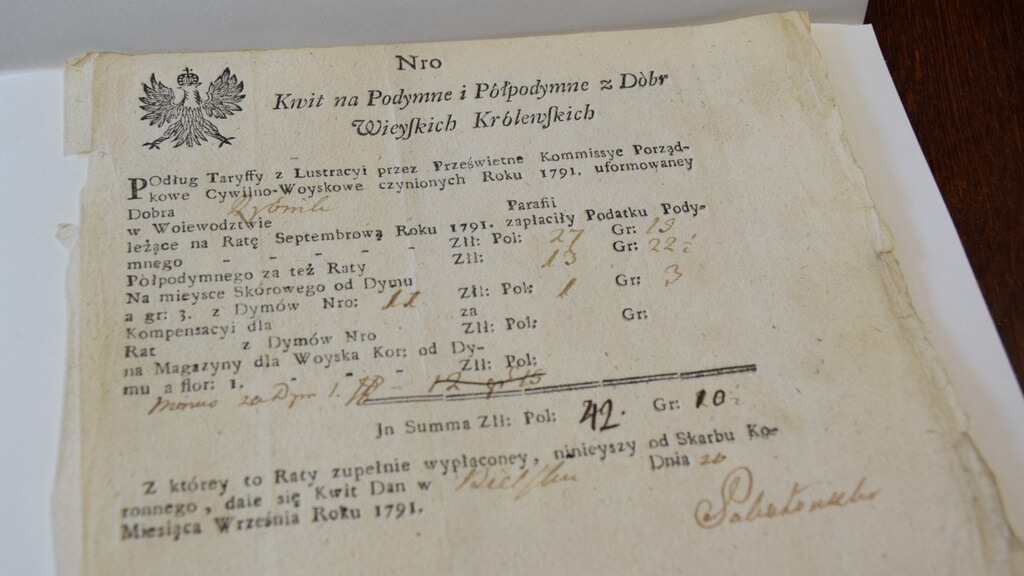 Wśród zakupionych podczas aukcji dokumentów jest m.in. kwit z 1791 roku na podymne i półpodymne czyli podatek z podana kwotą i wyliczeniem rat wystawiony w starostwie knyszyńskim.