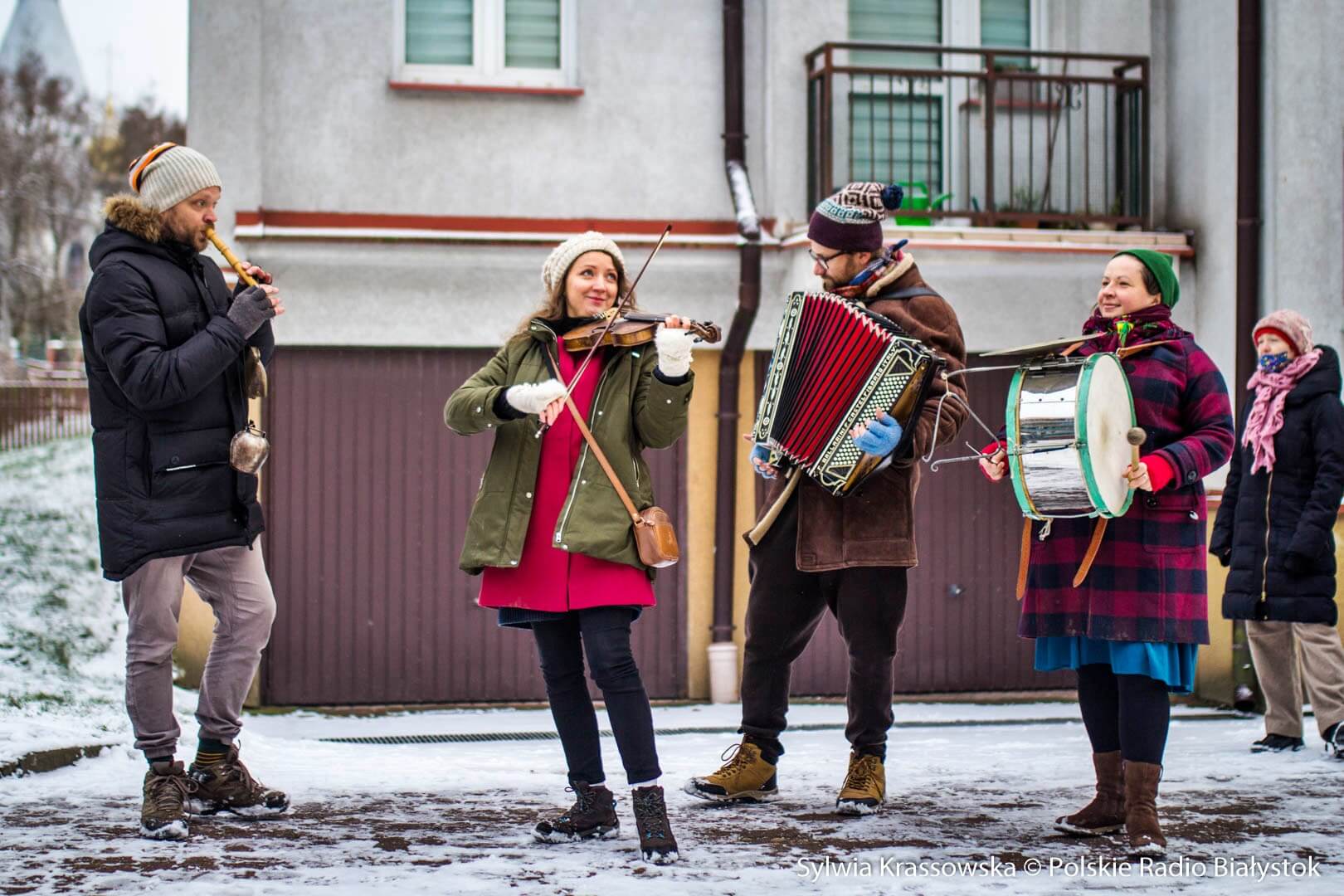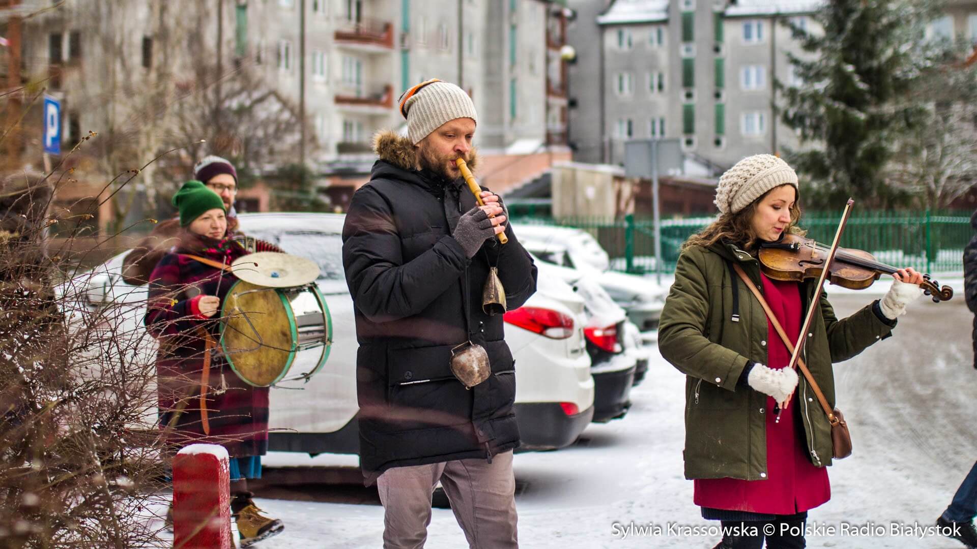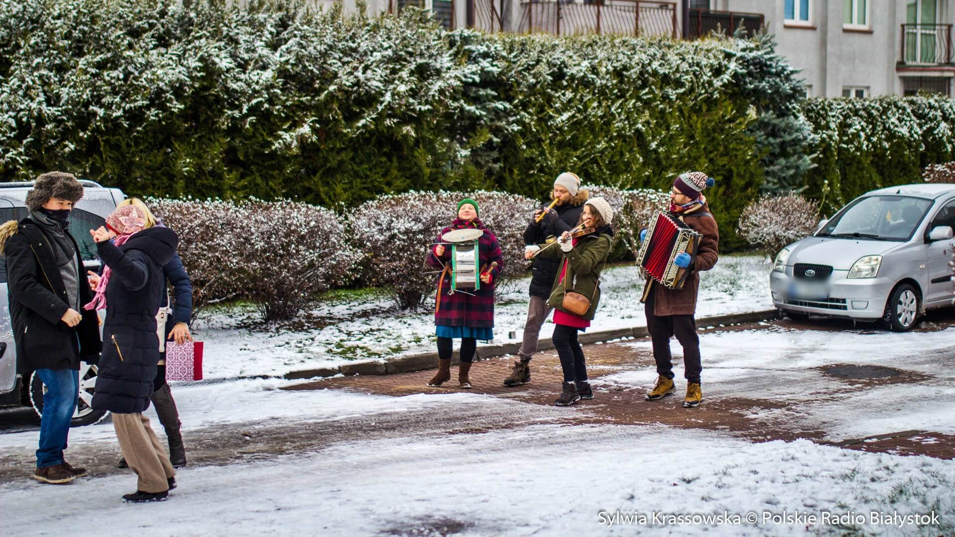 W zimowej, śnieżnej scenerii w niedzielę (13.12) Kapela Batareja muzykowała świątecznie pod balkonami mieszkańców białostockich osiedli: Nowe Miasto i Piaski.