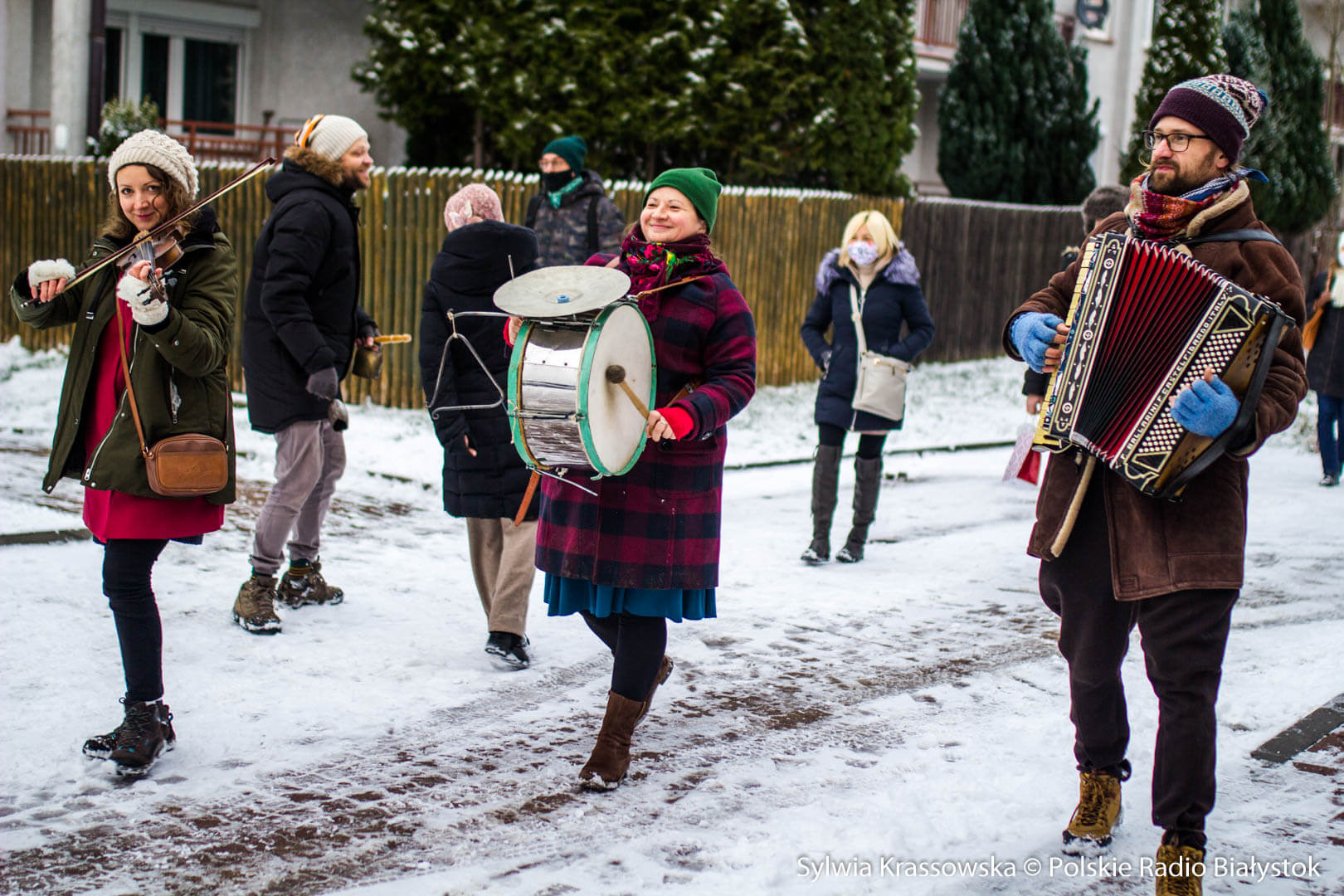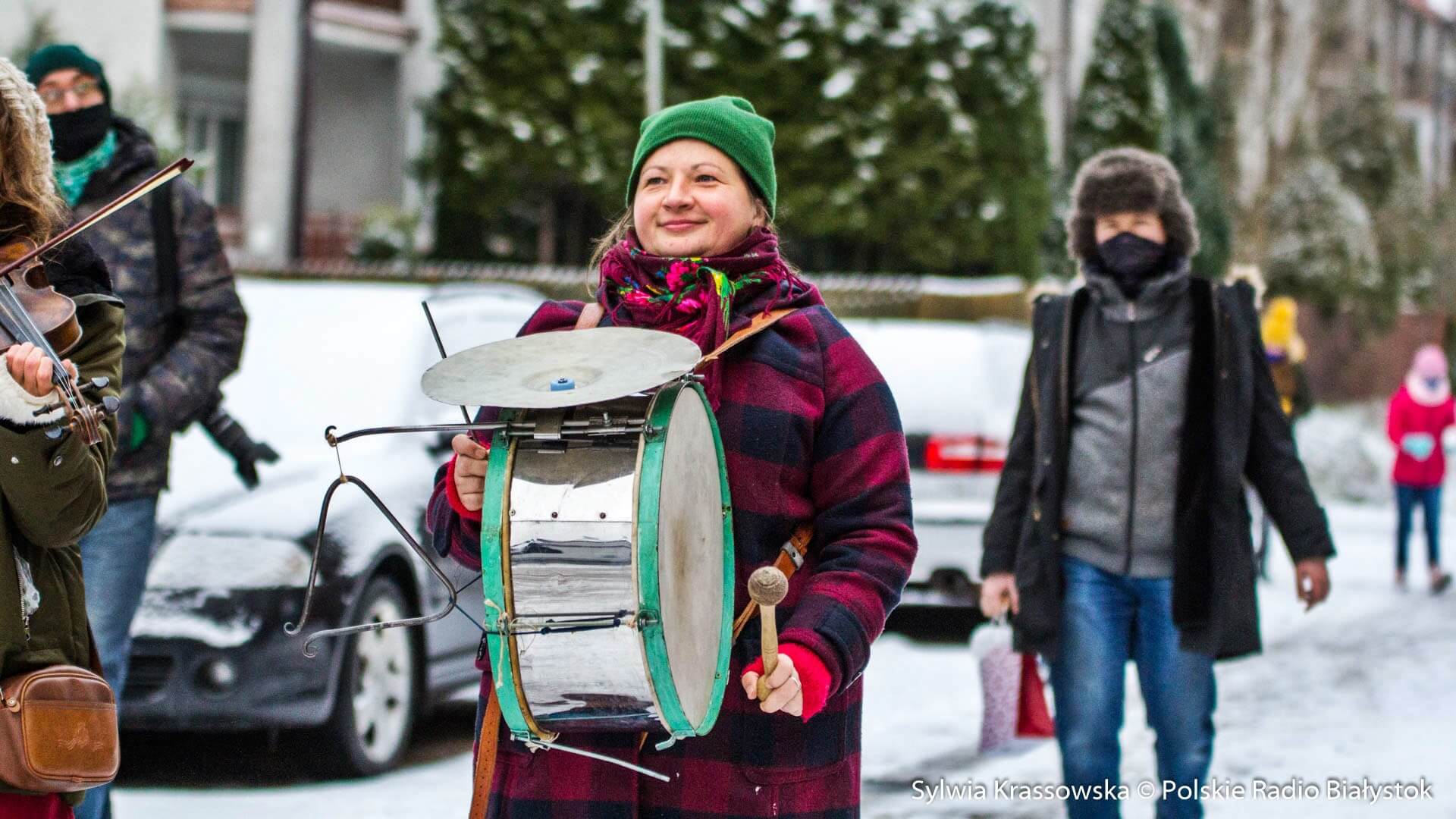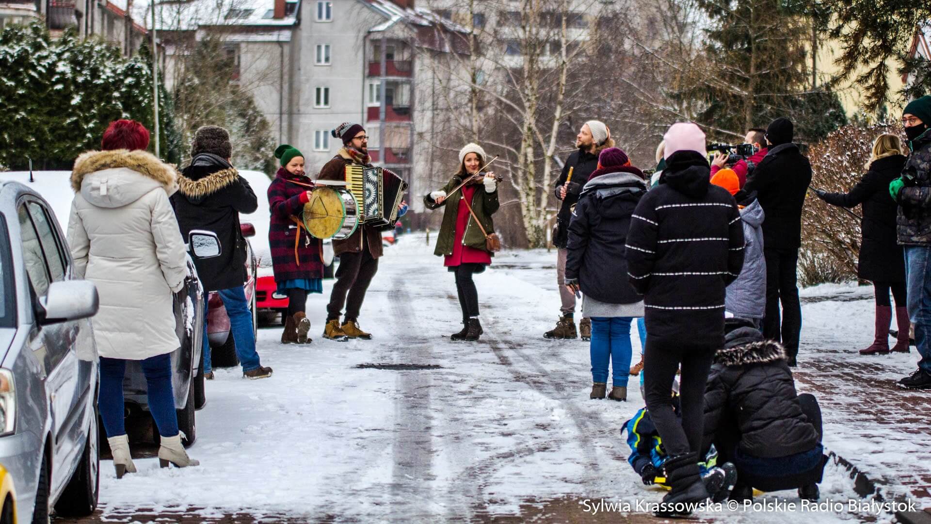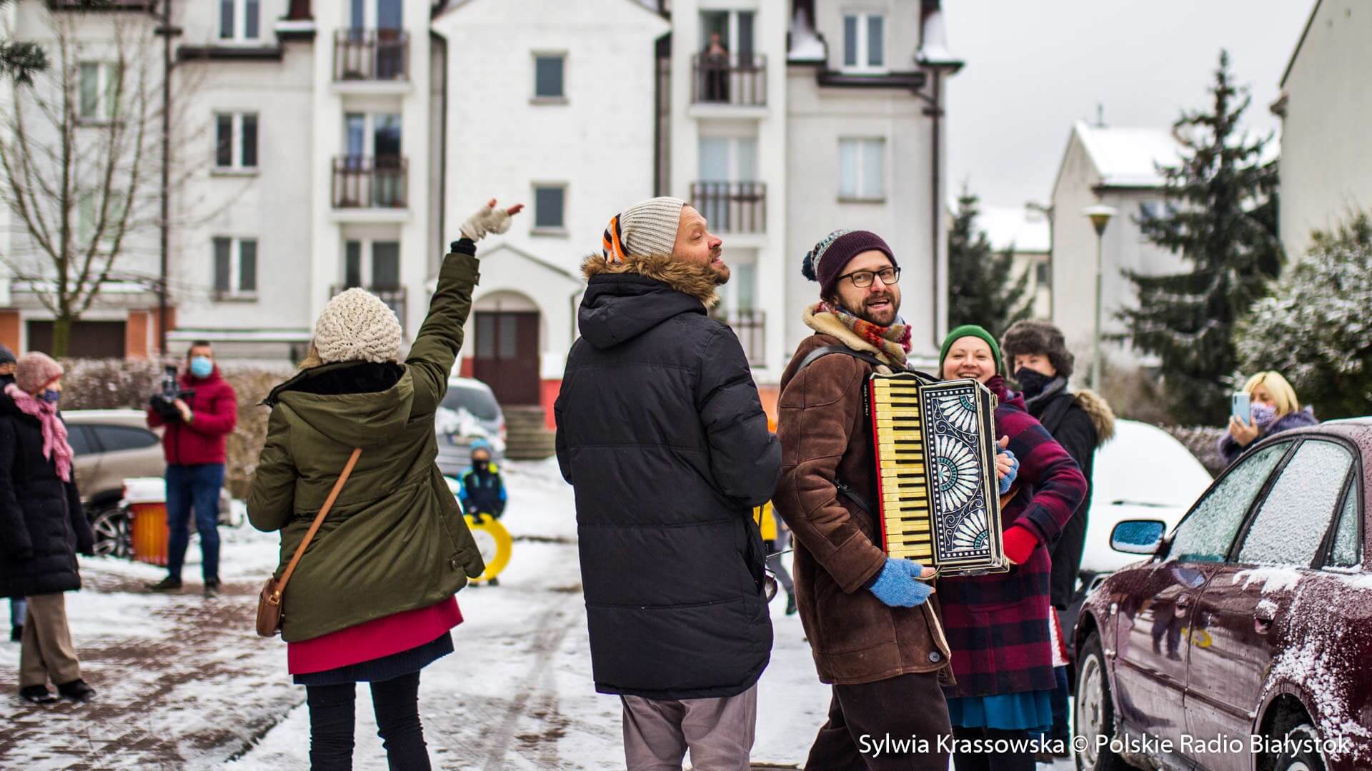 W zimowej, śnieżnej scenerii w niedzielę (13.12) Kapela Batareja muzykowała świątecznie pod balkonami mieszkańców białostockich osiedli: Nowe Miasto i Piaski.