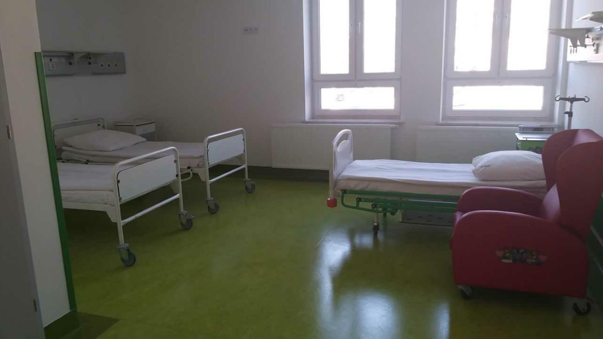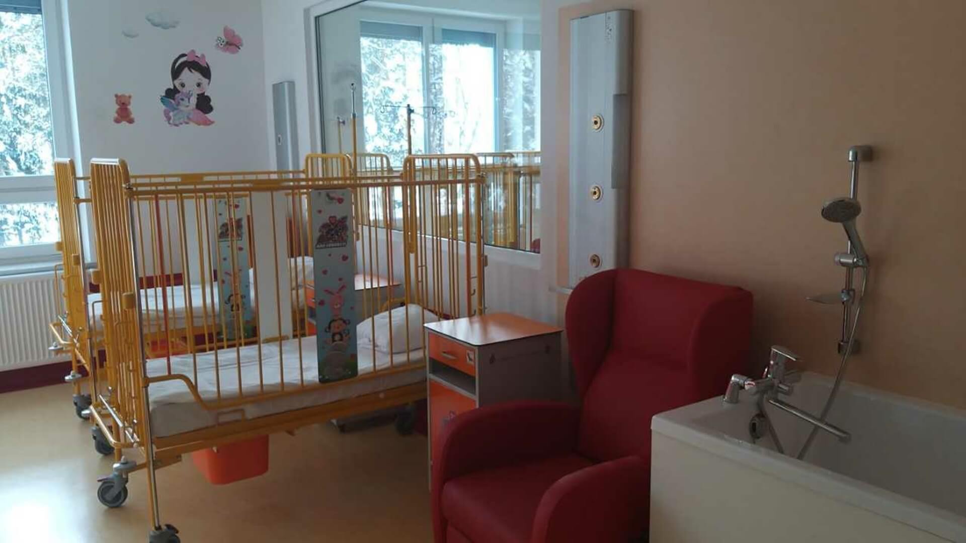 W pokojach najmłodszych dzieci oprócz łóżeczek, przewijaków i wanienek znajdują się rozkładane fotele dla rodziców i opiekunów. Szpital bezpłatnie udostępnia pościel.