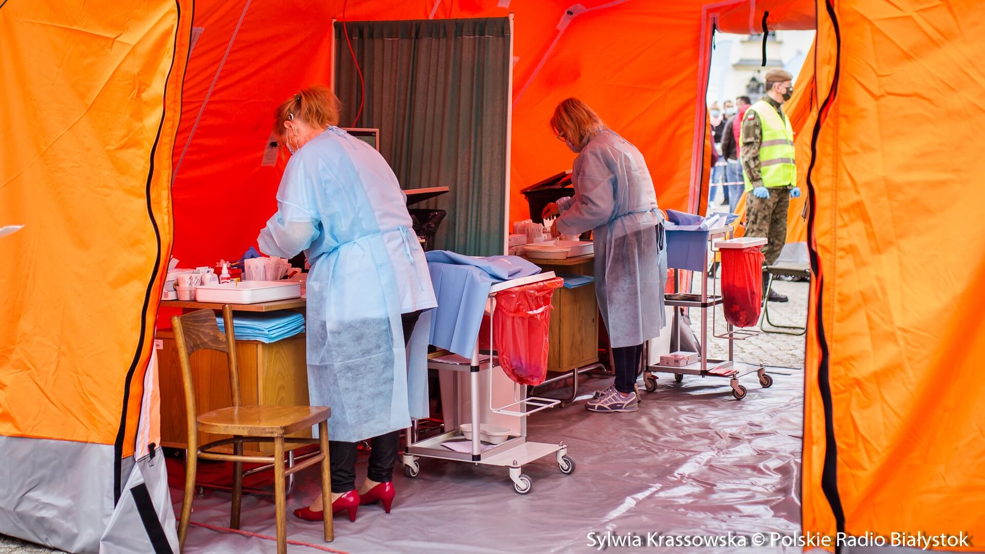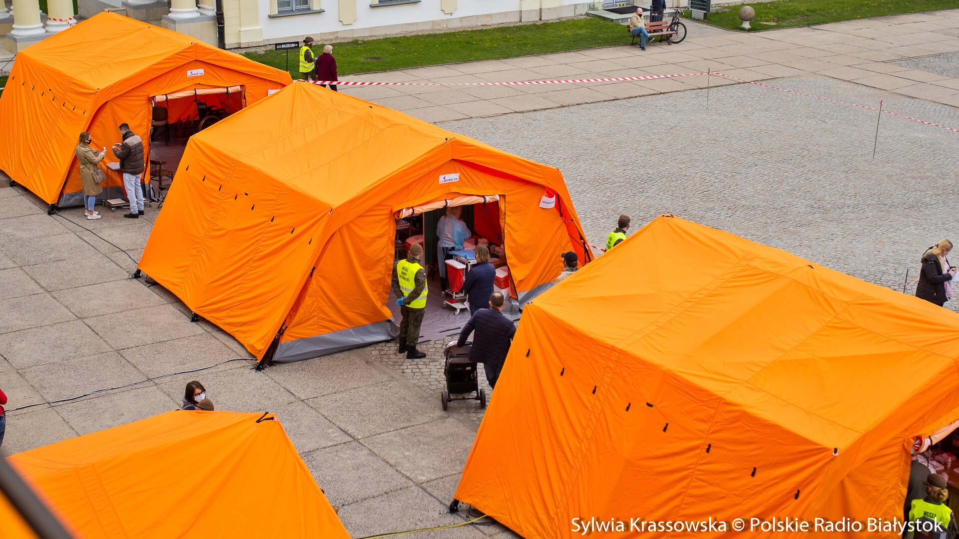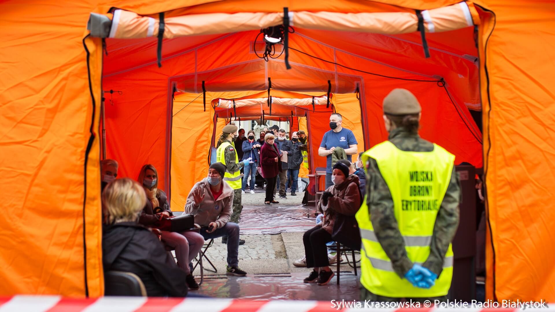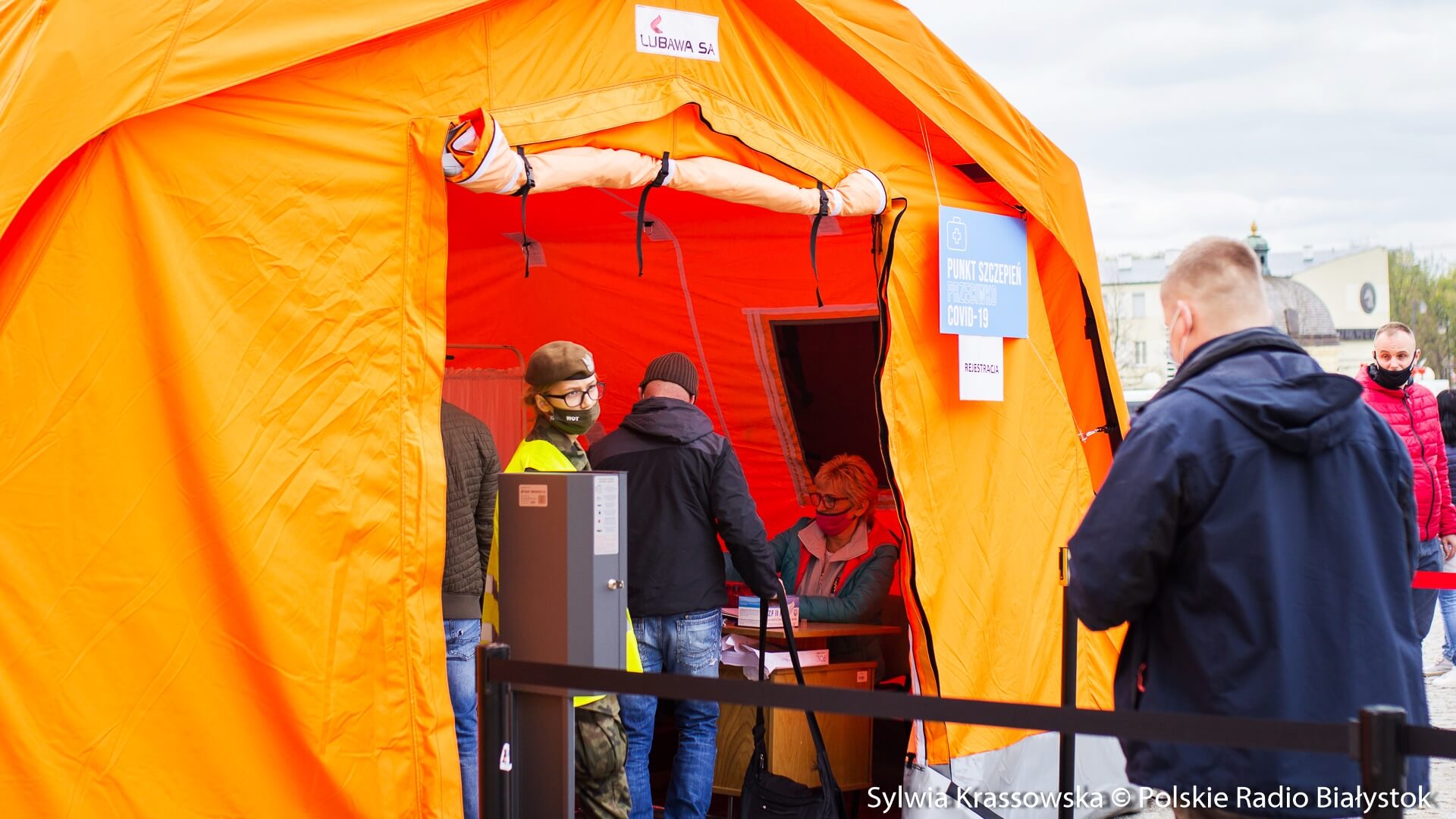 Kolejka chętnych w punkcie zlokalizowanym na dziedzińcu Pałacu Branickich w Białymstoku ustawiła się jeszcze przed godz. 10:00, dlatego pierwsze szczepienia rozpoczęto nieco wcześniej, niż planowano. W sumie pracują tam trzy zespoły (lekarz plus pielęgniarka) i rejestratorka, medykom z Uniwersyteckiego Szpitala Klinicznego (USK) w Białymstoku pomagają żołnierze WOT.