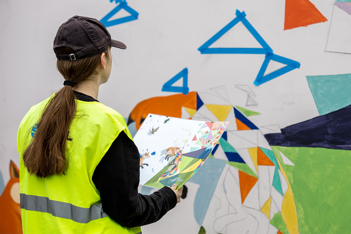 Kolorowe trójkąty, z których wyłaniają się stylizowane zwierzęta i drzewa będą zdobić betonowy mur oporowy w parku przemysłowym przy ulicy Aksamitnej w Białymstoku.