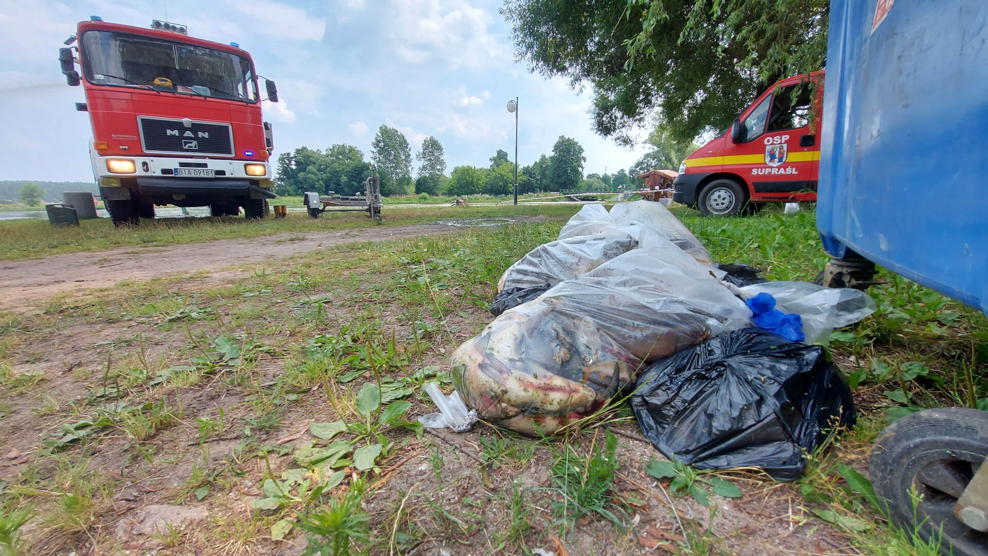 W Supraślu i Wasilkowie wędkarze odławiają śnięte ryby, które trzeba zutylizować. Pomagają im w tym strażacy, którzy przy okazji starają się napowietrzać wodę.
