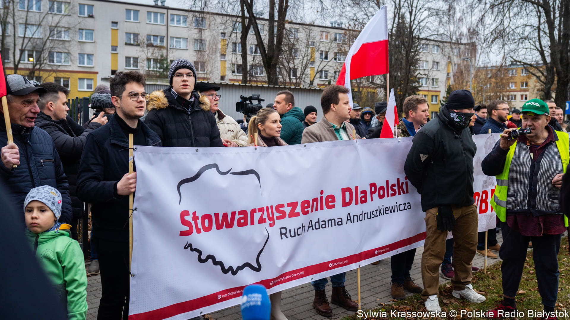Przed siedzibą Podlaskiego Oddziału Straży Granicznej w Białymstoku odbyła się w niedzielę (07.11) manifestacja poparcia dla działań pograniczników i innych służb mundurowych, zabezpieczających granicę z Białorusią w związku z kryzysem migracyjnym.