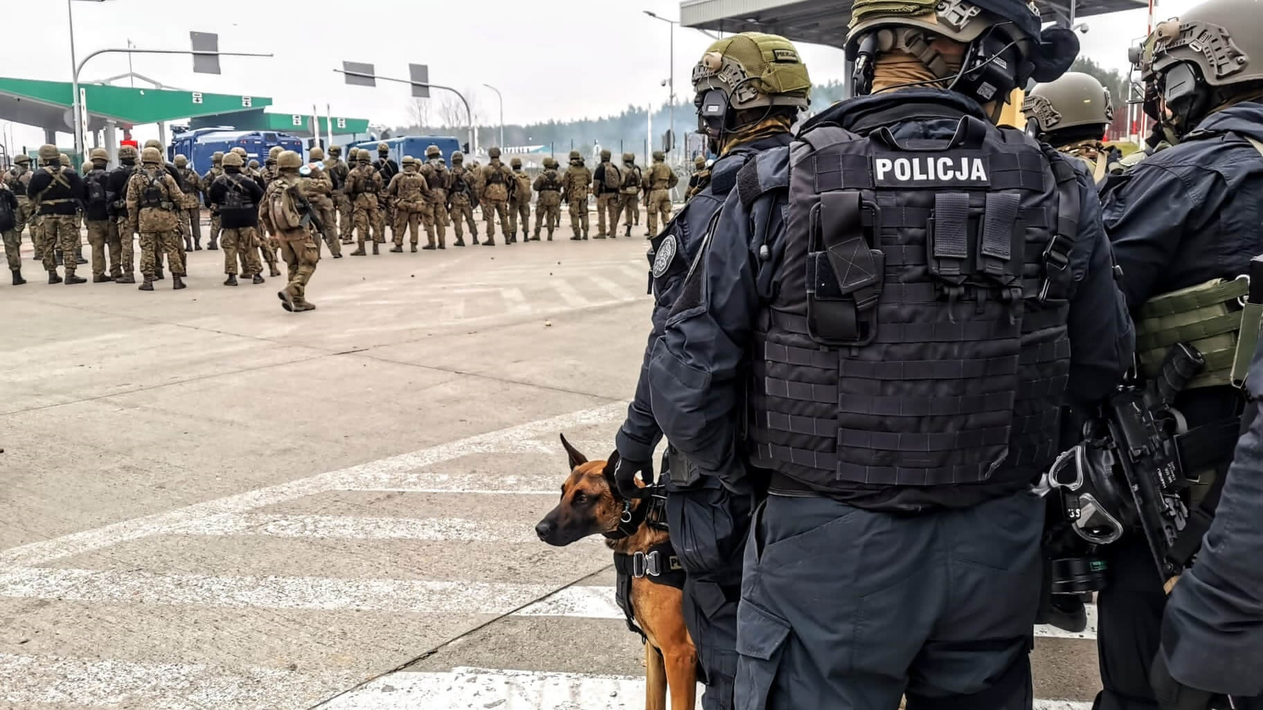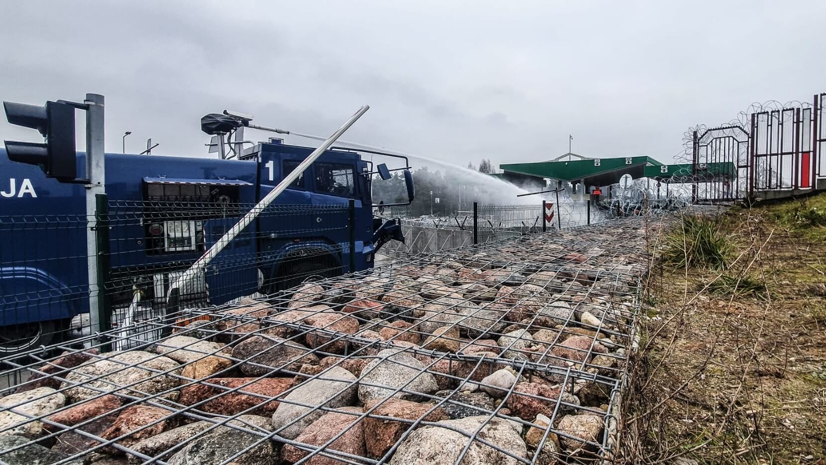 Podlaska policja opublikowała też wcześniej zdjęcia pokazujące z góry sytuację wokół przejścia granicznego. Widać było na nich m.in. kilka armatek wodnych stojących zarówno przed platformą na przejściu Kuźnica-Bruzgi, jak i jeżdżących po pasie drogi granicznej obok przejścia. Imigranci wycofali się za wiaty na pasach odpraw paszportowo-celnych, część zgromadzona jest pod tymi wiatami. Co najmniej kilkadziesiąt osób jest też obok platformy.