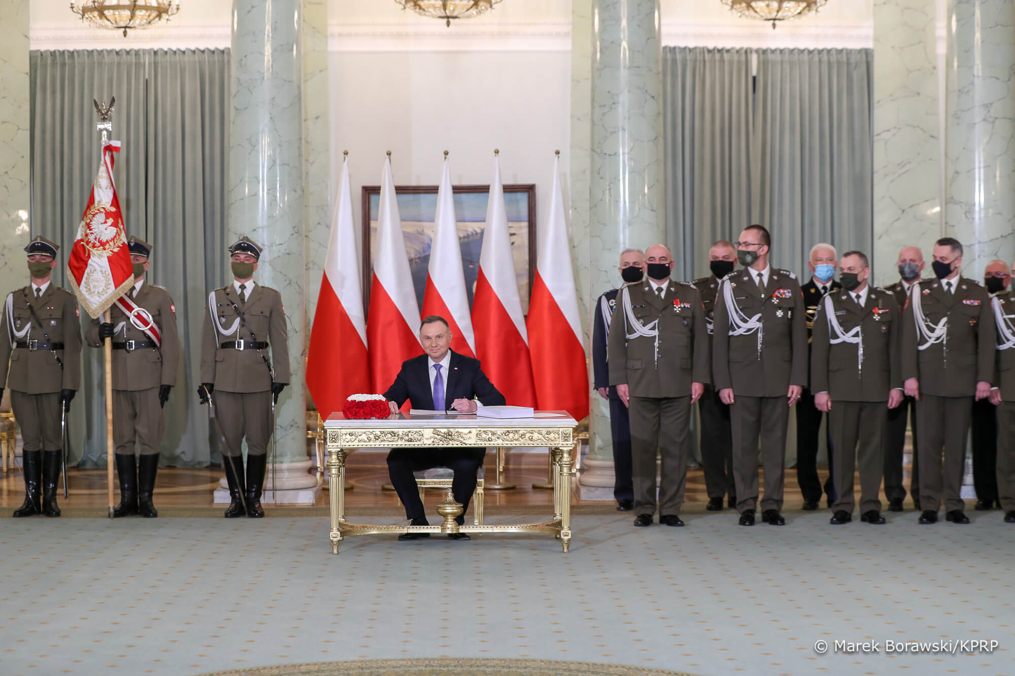 W uroczystości w Pałacu Prezydencki wziął udział m.in. premier Mateusz Morawiecki, wicepremier Jarosław Kaczyński oraz przedstawiciele sił zbrojnych.