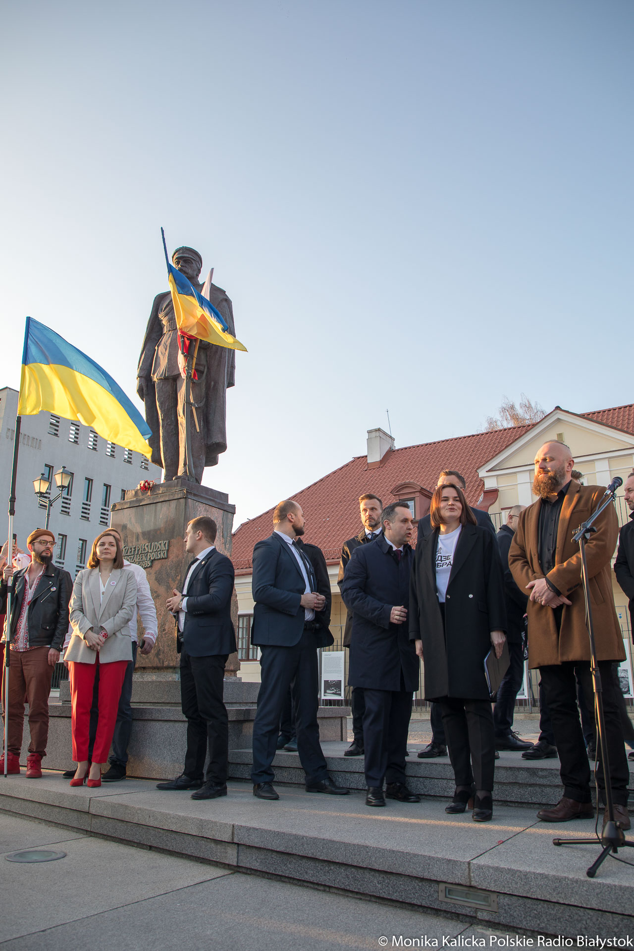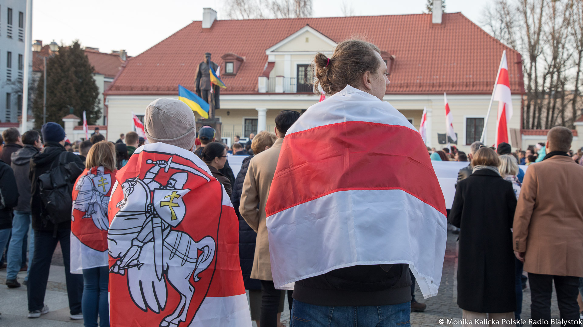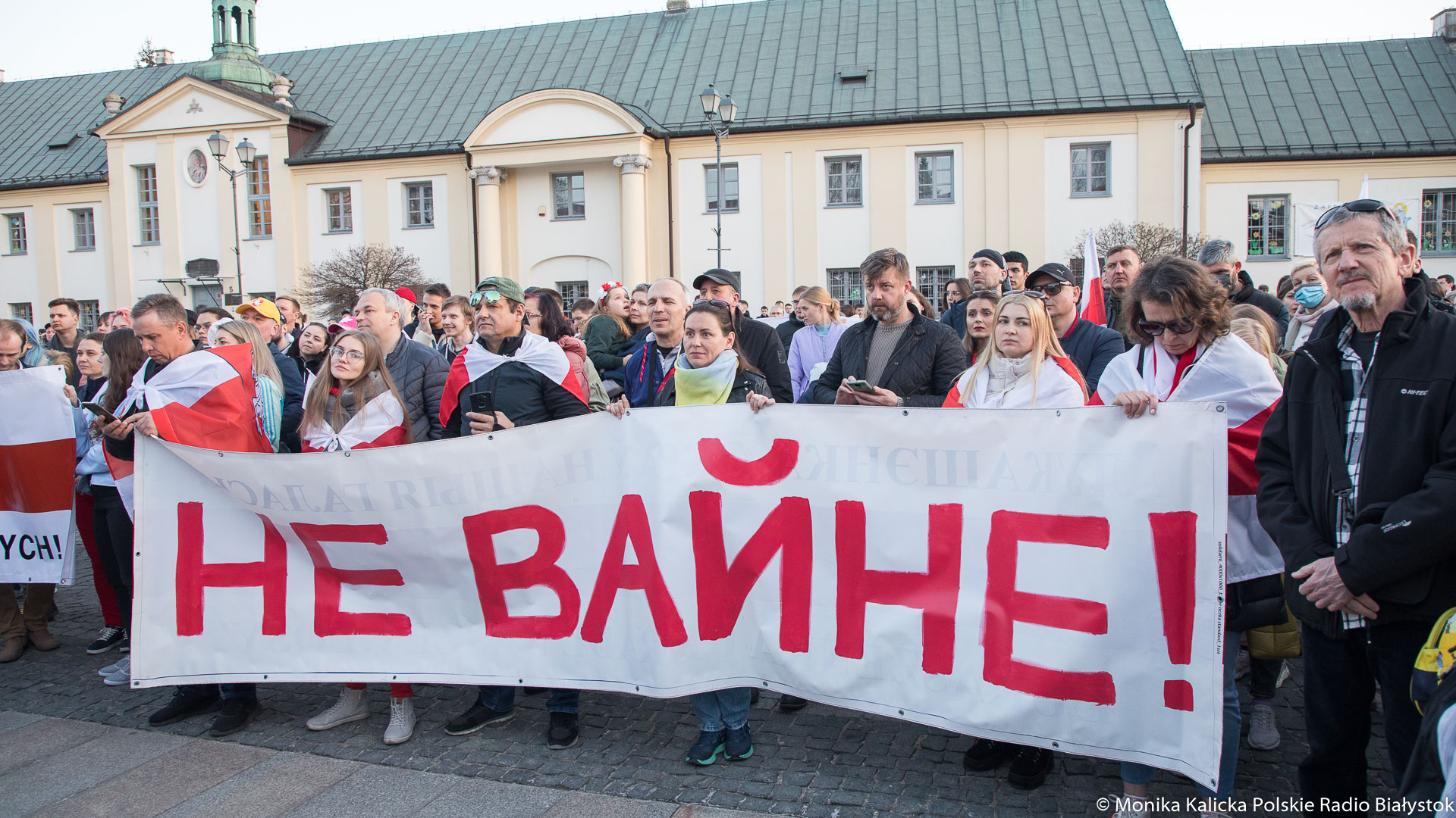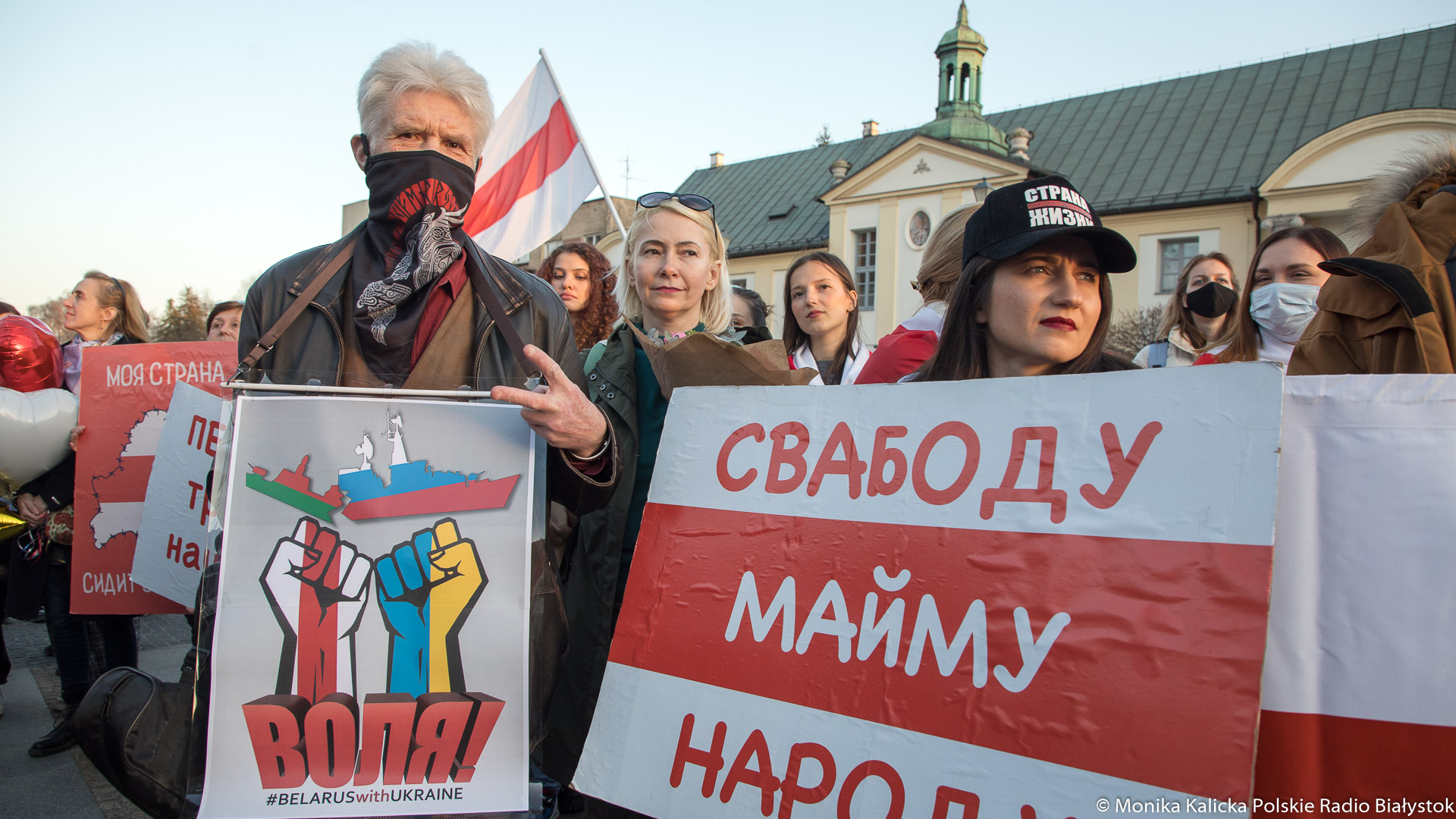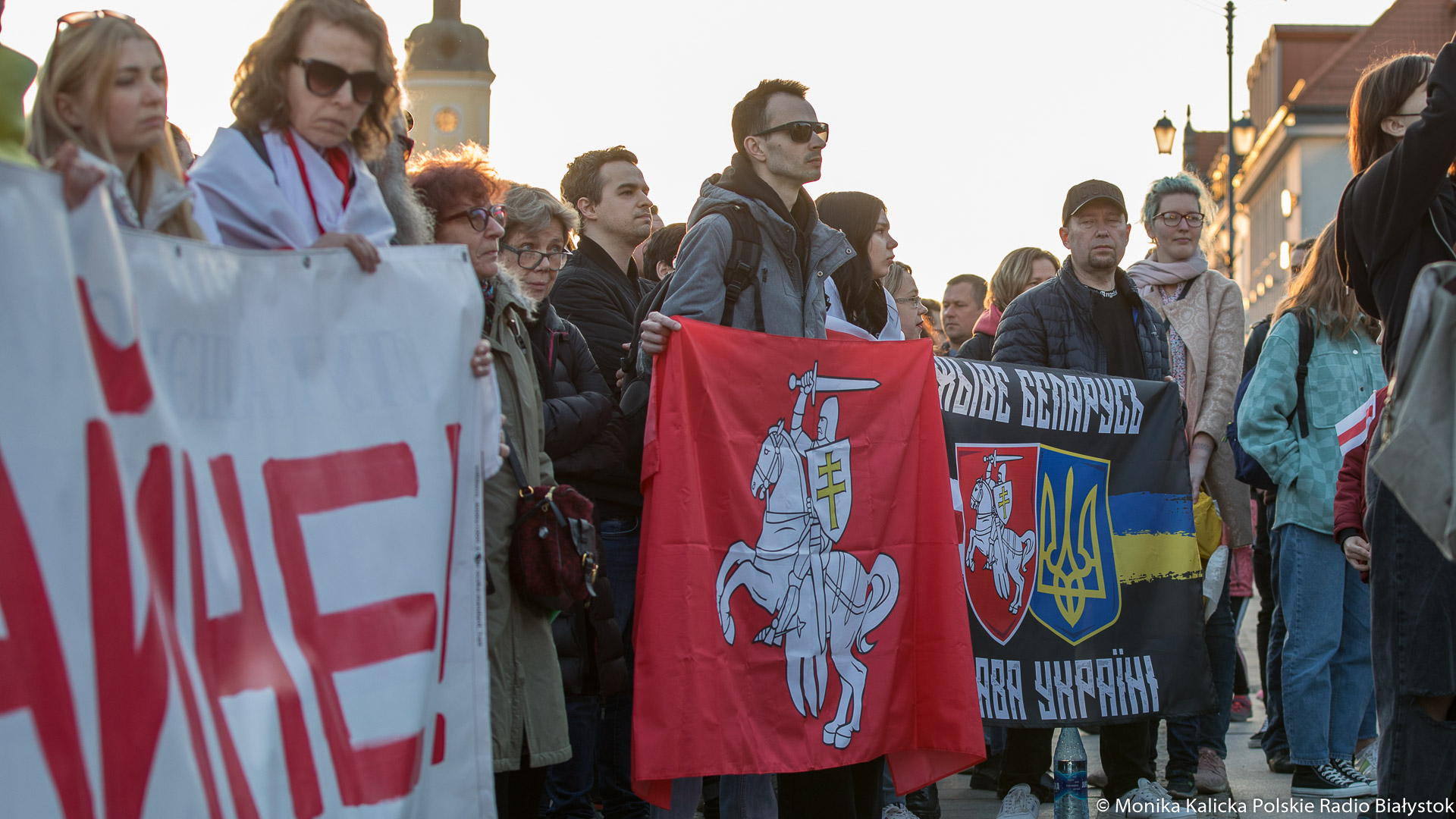Na spotkaniu w Białymstoku skandowano wielokrotnie "Żywie Biełaruś", ale także "Sława Ukraini". Uczestnicy spotkania mieli biało-czerwono-białe flagi używane przez opozycję białoruską, były też flagi ukraińskie, transparenty "Wolność więźniom politycznym", "Nie wojnie". W manifestacji wzięli udział Białorusini, władze Białegostoku, politycy KO, władze miasta.