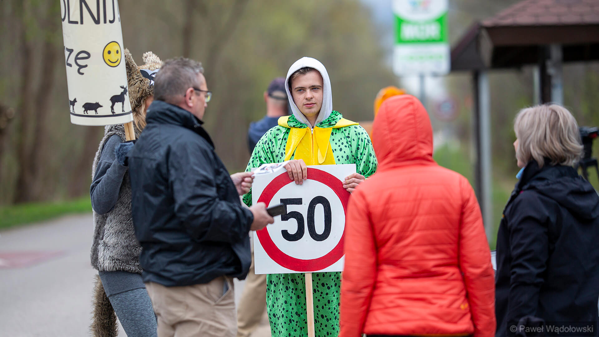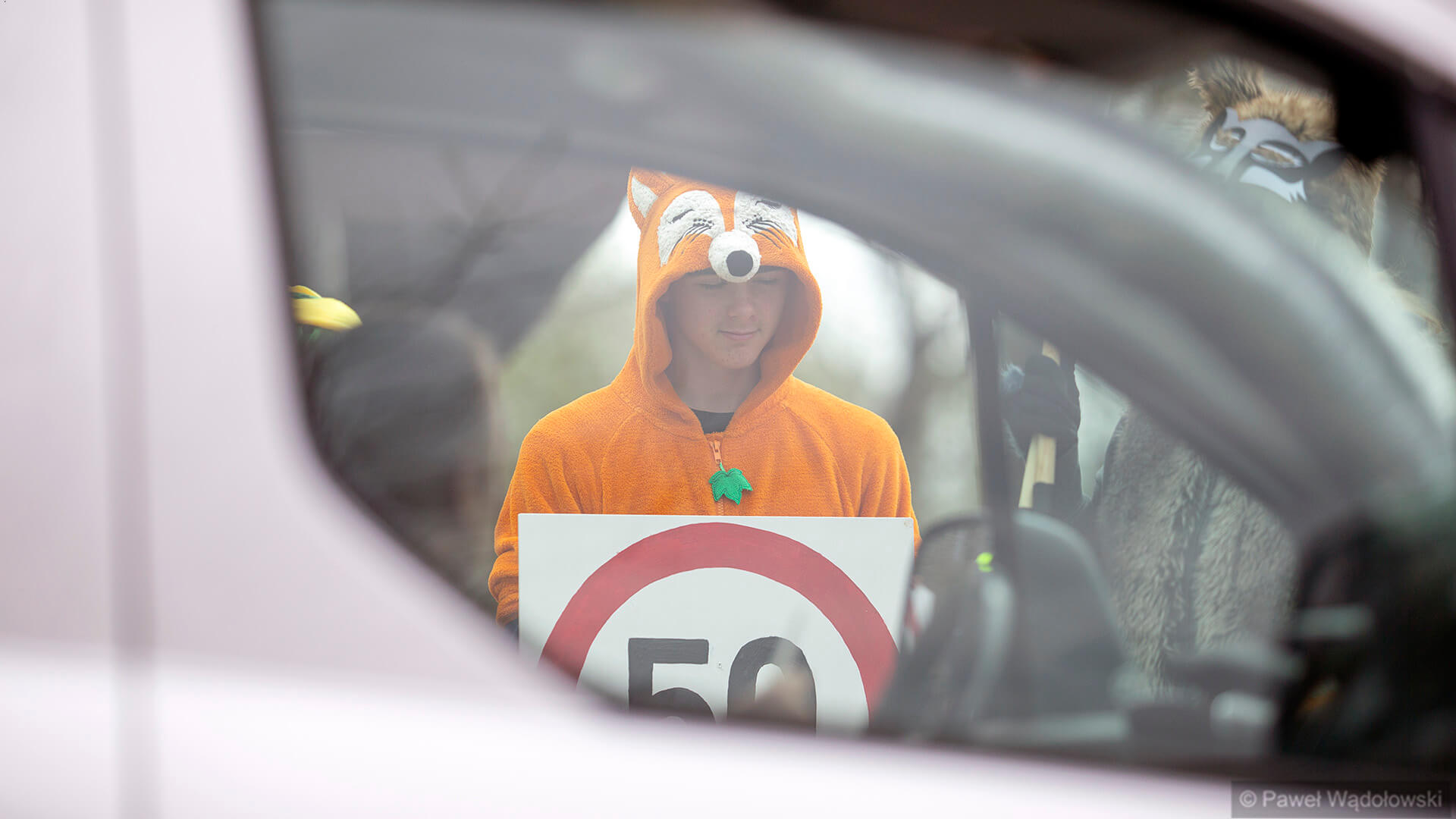Przebrani w stroje zwierząt członkowie Towarzystwa Biebrzańskiego stoją w najpopularniejszych miejscach Carskiej Drogi i przypominają kierowcom, że na całej trasie obowiązuje ograniczenie prędkości do pięćdziesięciu kilometrów na godzinę.