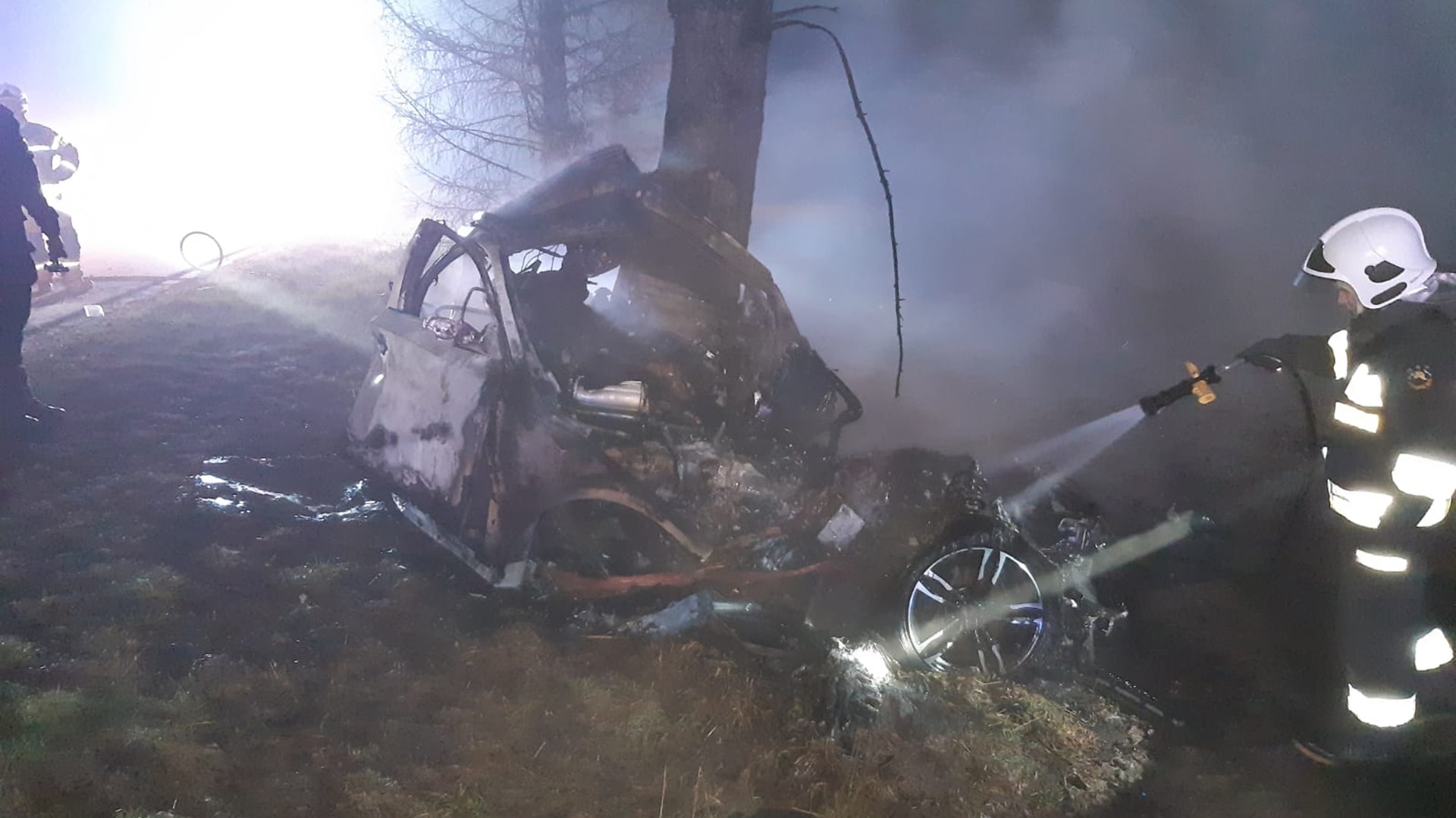 Kierowca BMW stracił panowanie nad autem i uderzył w drzewo. Doszło do pożaru.
