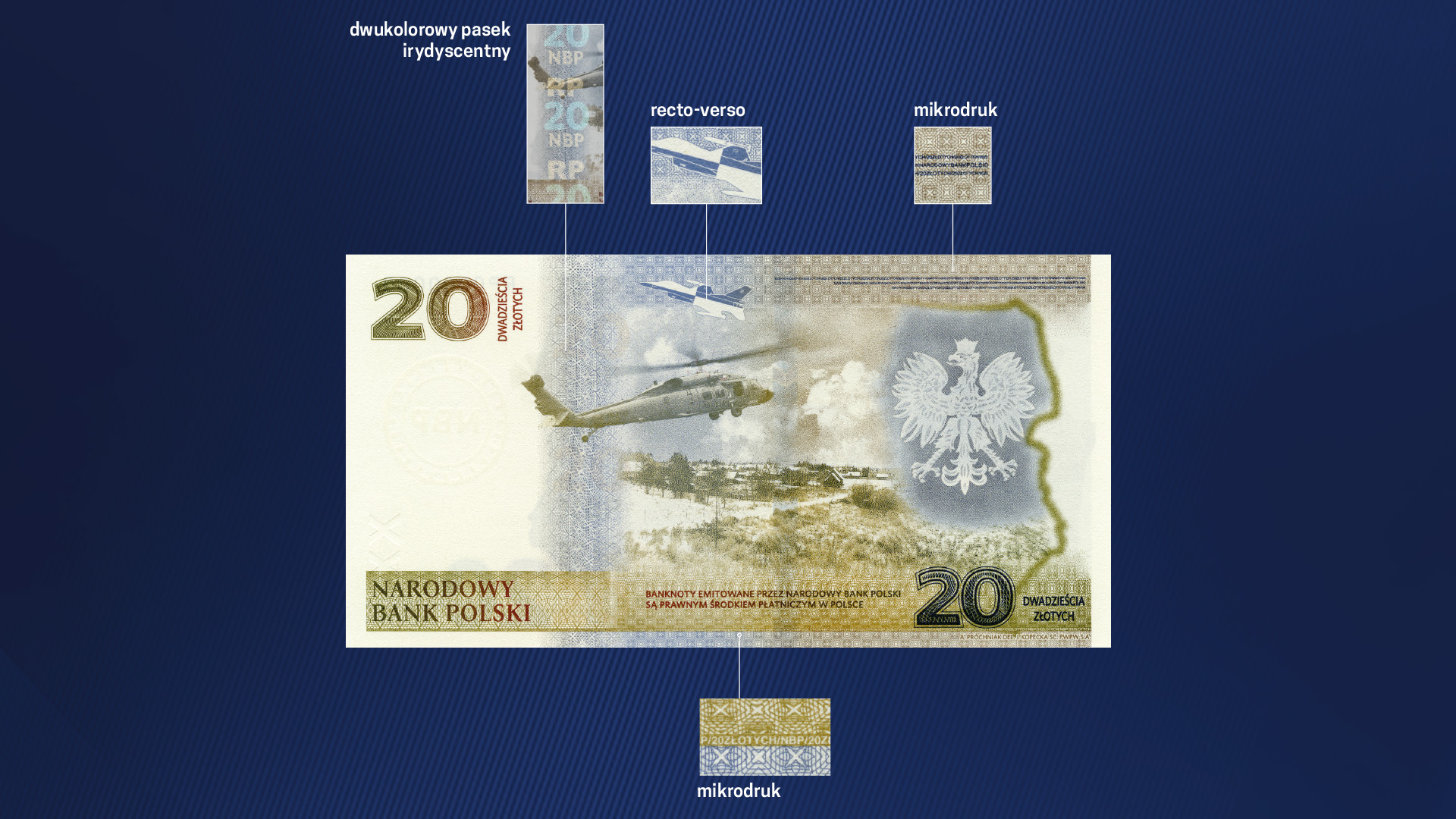 Na przedniej stronie banknotu są sylwetki funkcjonariusza Straży Granicznej i żołnierza Wojska Polskiego, a także fragment mapy Polski. Z drugiej strony jest wizerunek orła z polskiego godła, a także policyjny śmigłowiec na tle krajobrazu terenów przy wschodniej granicy Polski.