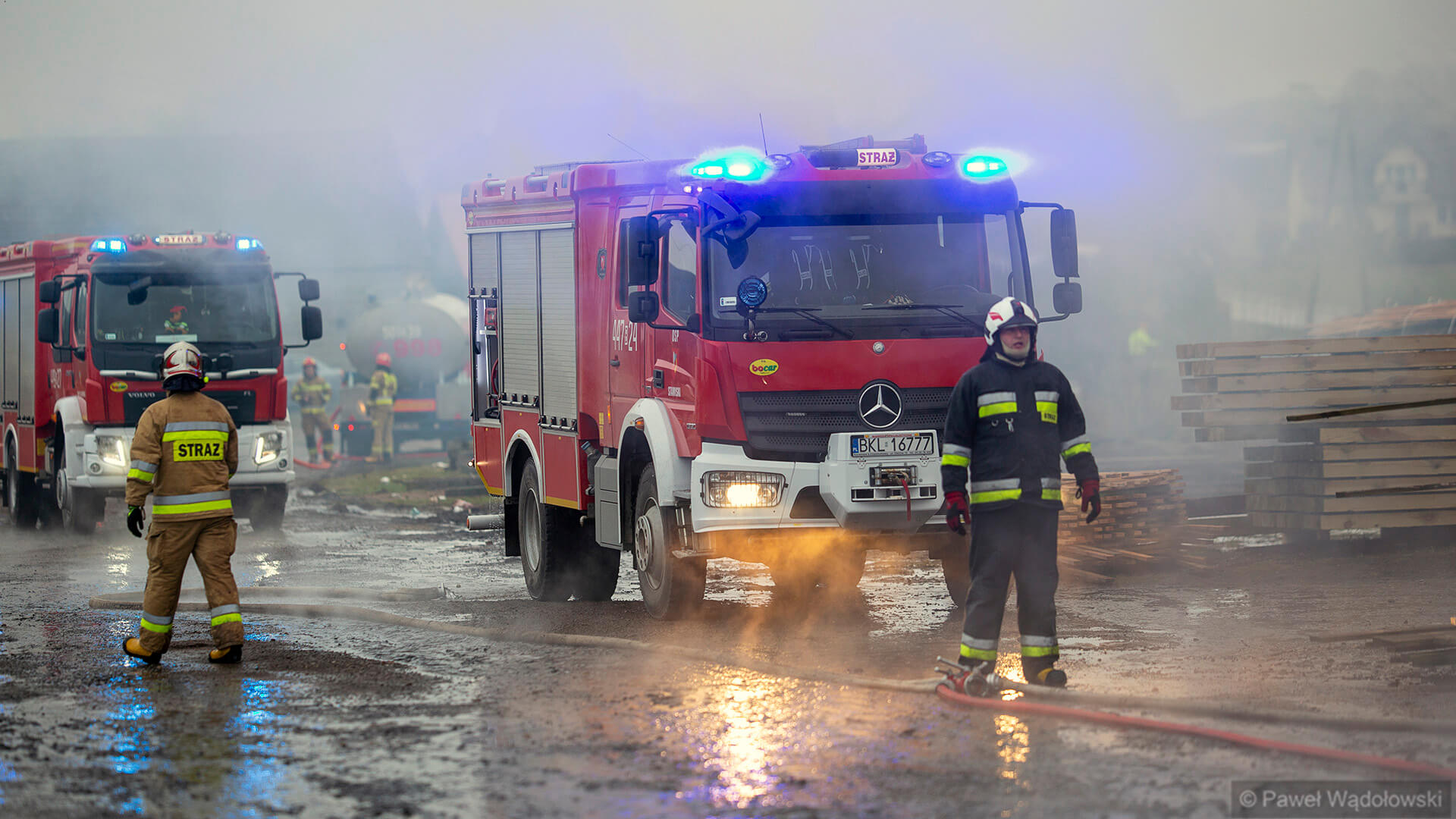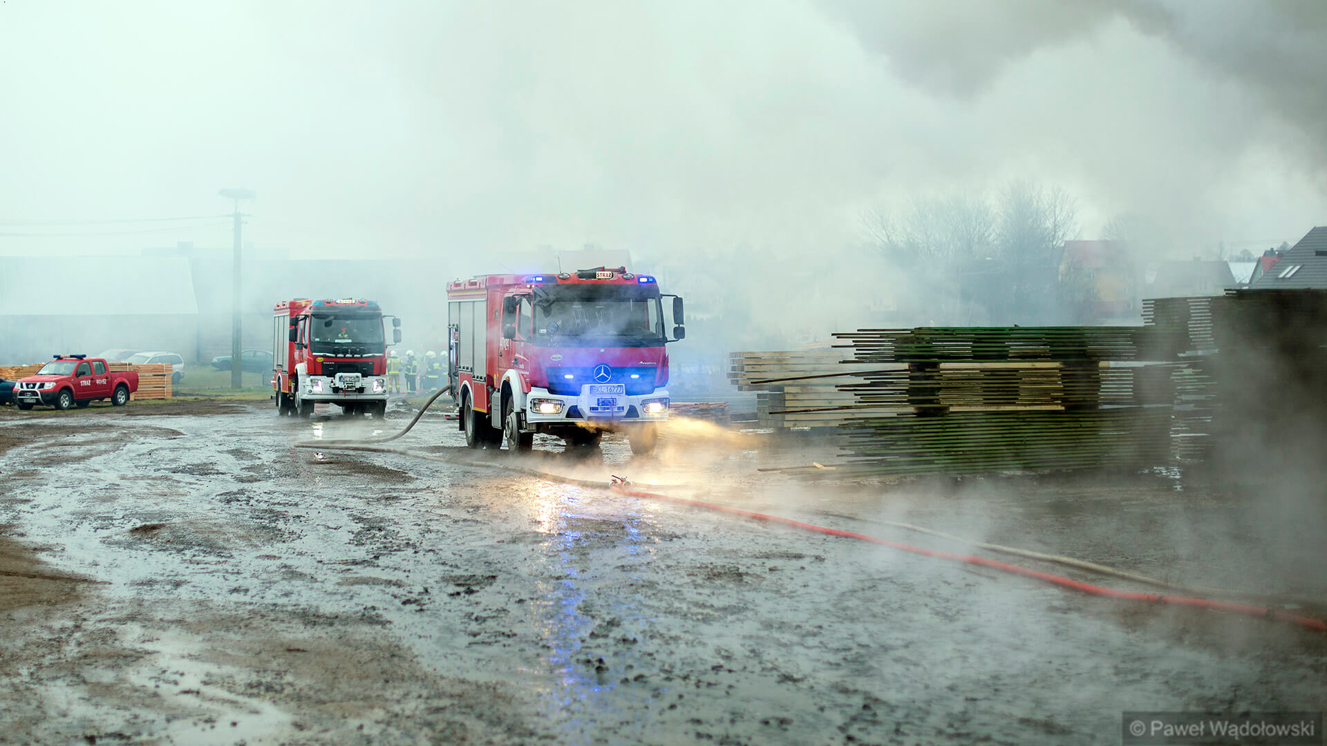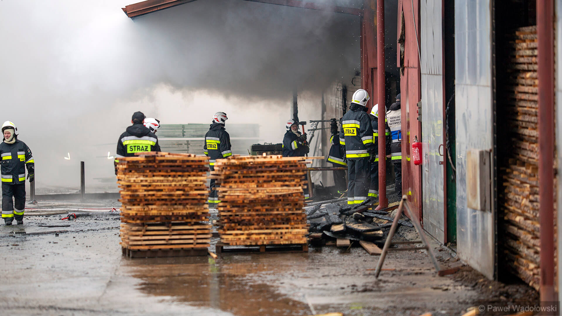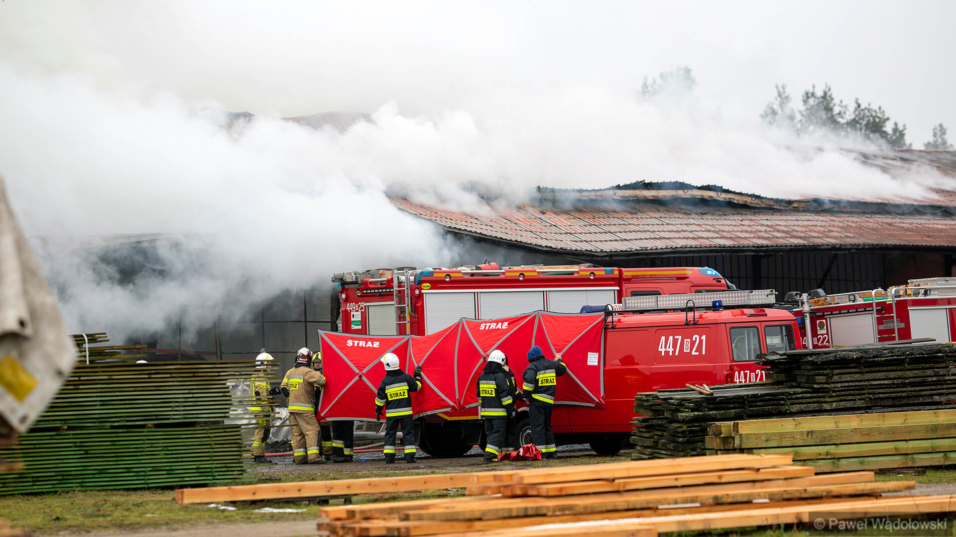 W akcji gaśniczej brało udział ponad 20 jednostek z terenu powiatu kolneńskiego i jedna - cysterna - z Zambrowa. Było to istotne wsparcie, bo strażacy musieli jeździć po wodę aż do Kolna. Na razie nie oszacowano, jakiej wysokości straty spowodował ogień. Wiadomo, że zniszczony jest samochód ciężarowy, wózek widłowy, dach na 1/3 budynku, a także 100 m3 suchego drewna. Przyczyna pożaru nie jest jeszcze znana.