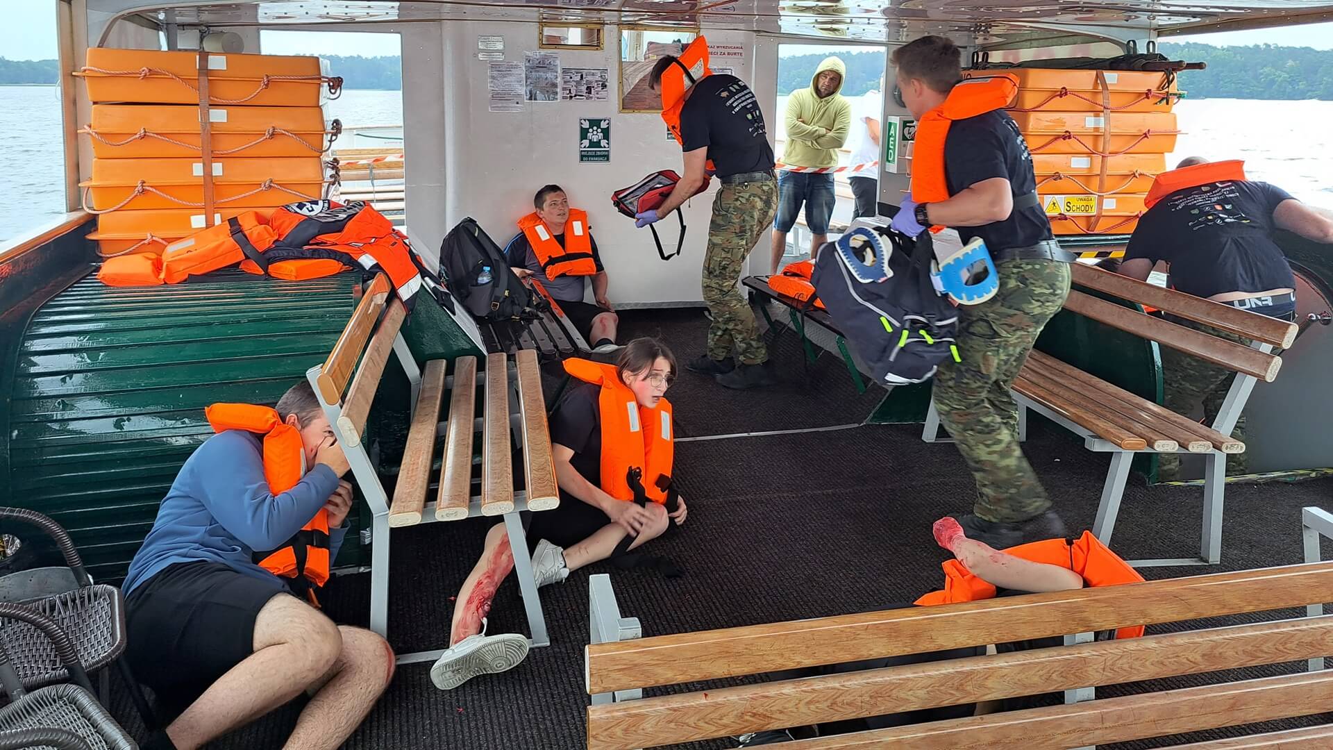 Zawodnicy mają do wykonania różne zadania, które mają pomóc im przełamać strach i lęk przed udzieleniem pomocy osobom poszkodowanym. Ewakuują właśnie pełen rannych osób statek. Na jego pokładzie wybuchł pożar. Musza posegregować ludzi, wybrać tych, którzy są w najpoważniejszym stanie, później tych mniej chorych oraz tych co mogą się samodzielnie ruszać - mówił ratownik medyczny podlaskiego oddziału straży granicznej Zbigniew Sobiesiak.