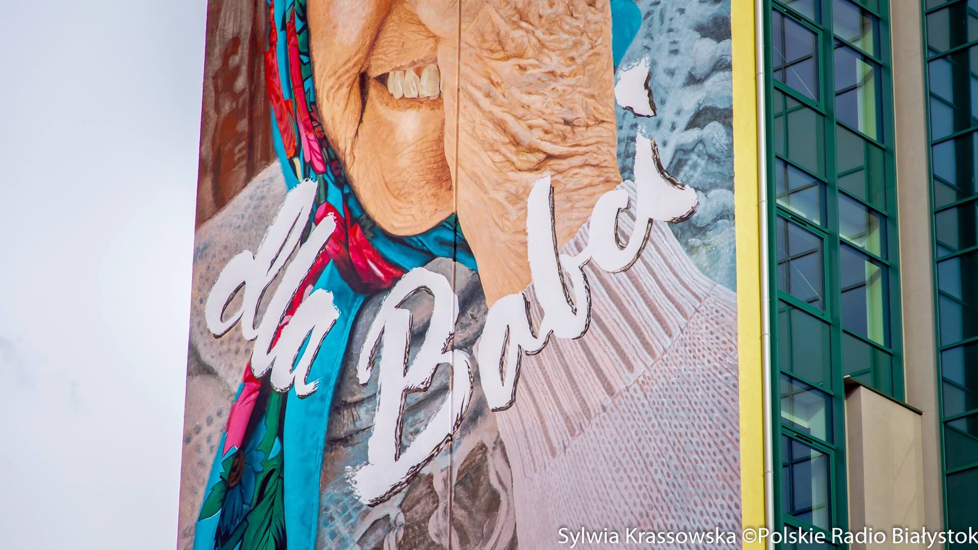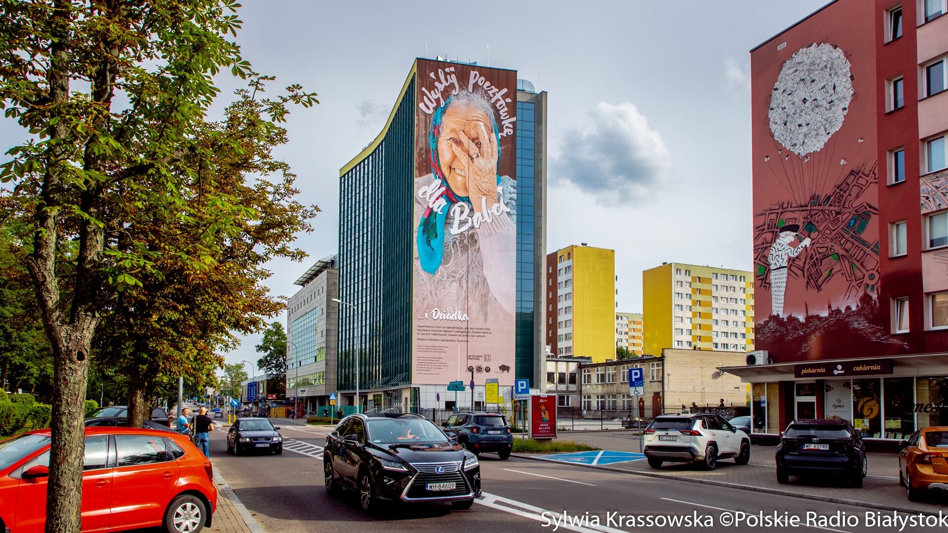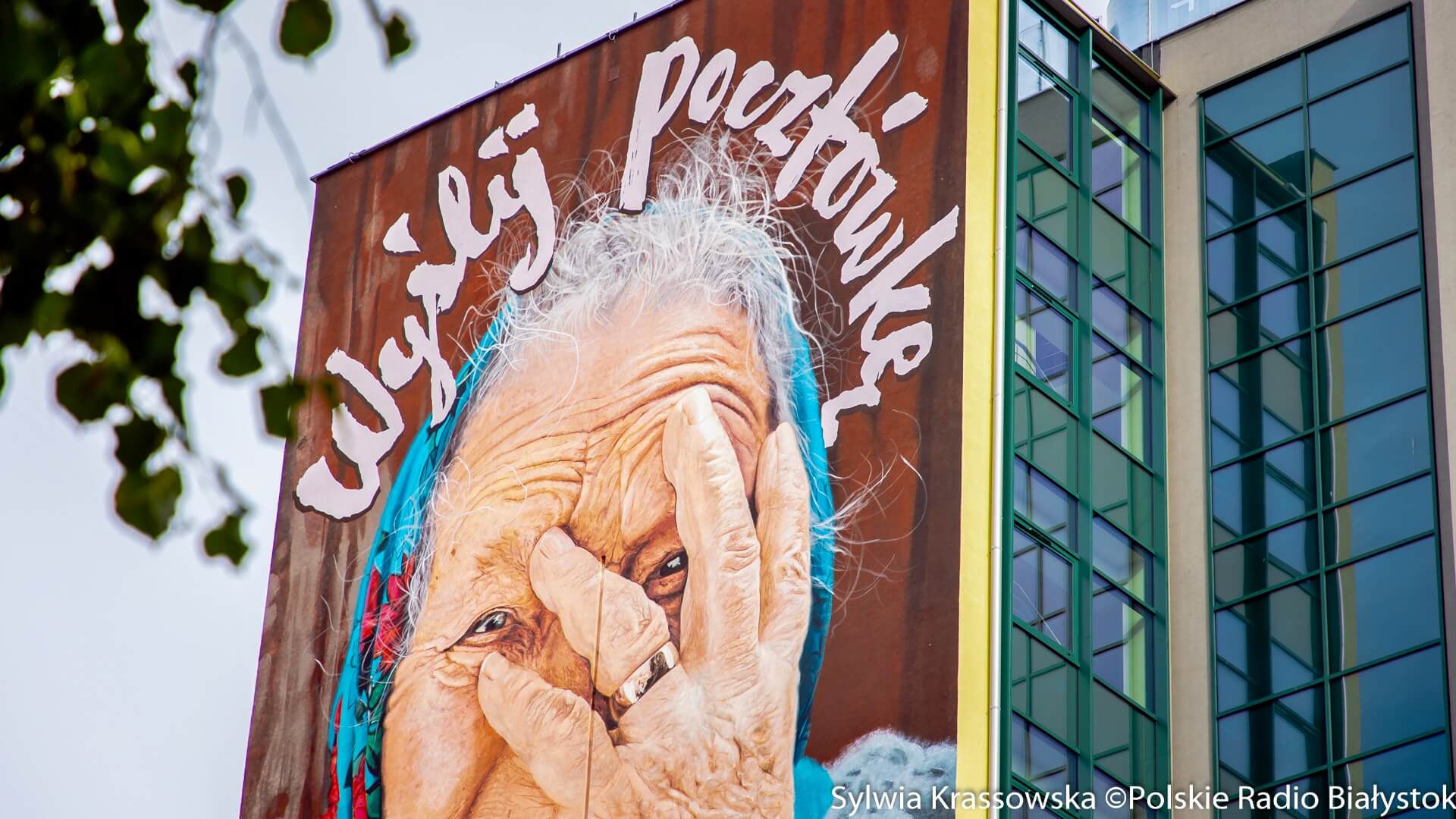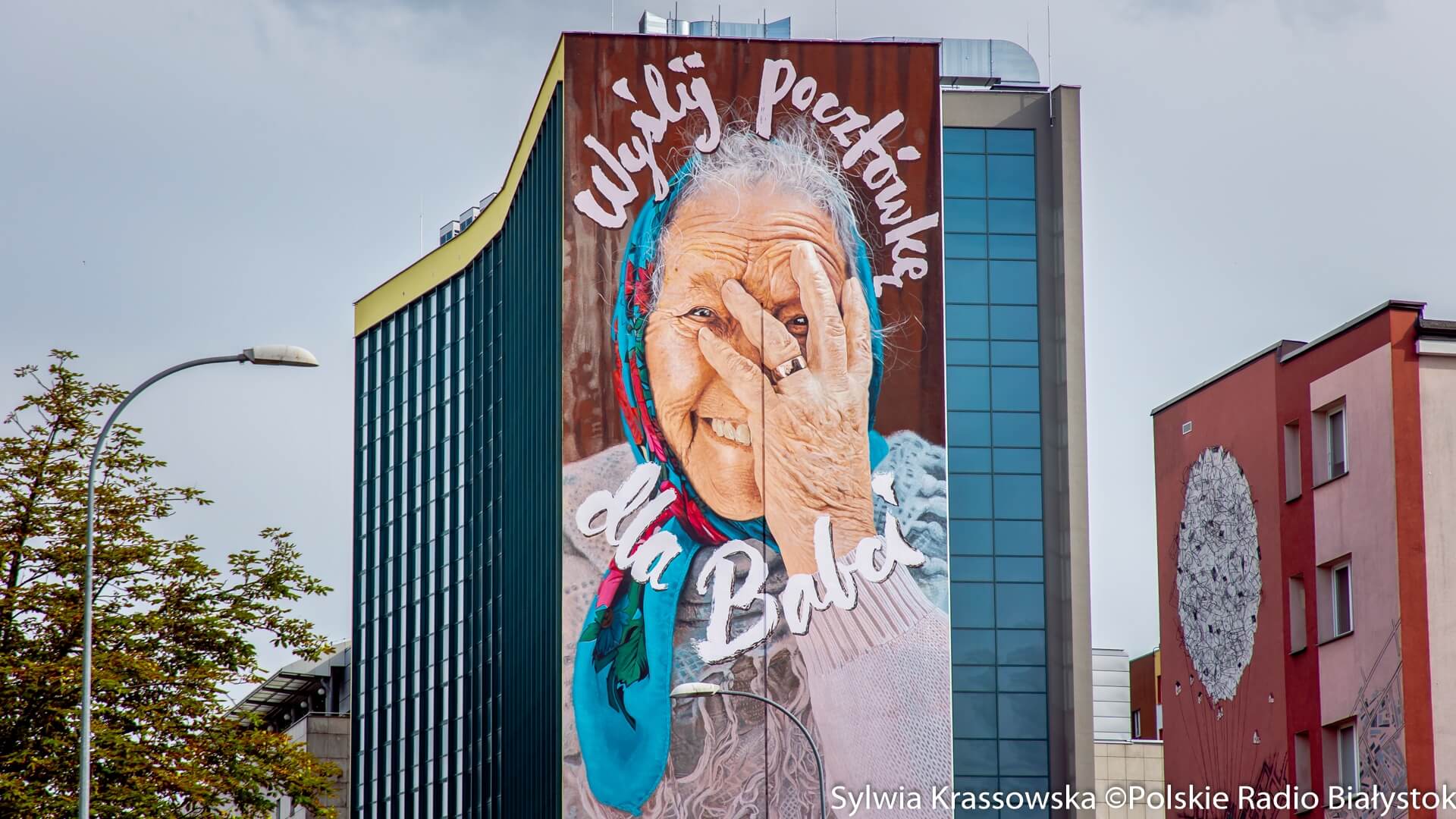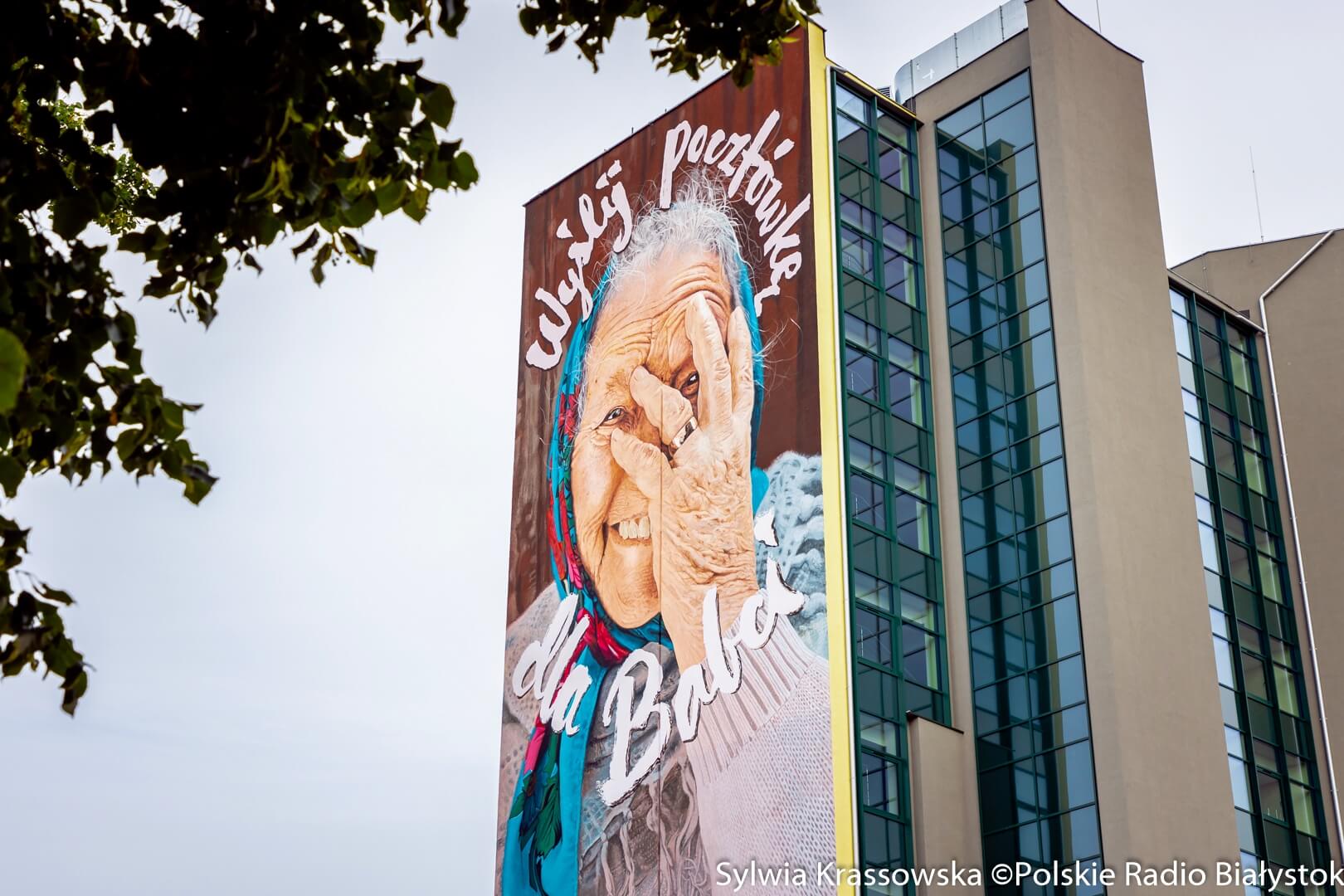 Radio Białystok | Wiadomości | Wiadomości - Mural "Wyślij pocztówkę dla babci" powrócił na ścianę wieżowca przy ul. Skłodowskiej-Curie w Białymstoku [zdjęcia]