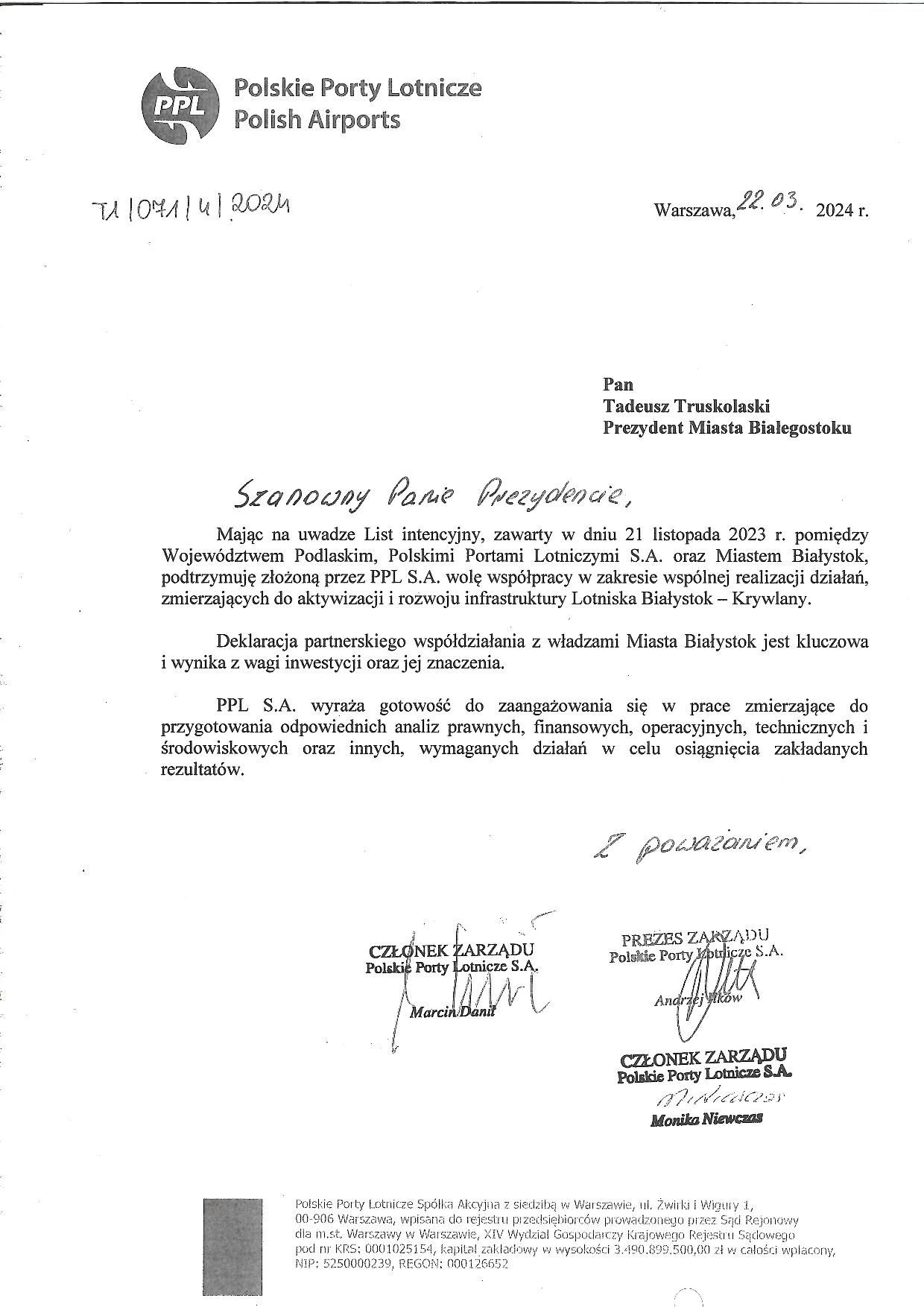 Władze Polskich Portów Lotniczych podtrzymują chęć pomocy w rozwoju infrastruktury Lotniska Białystok - Krywlany.