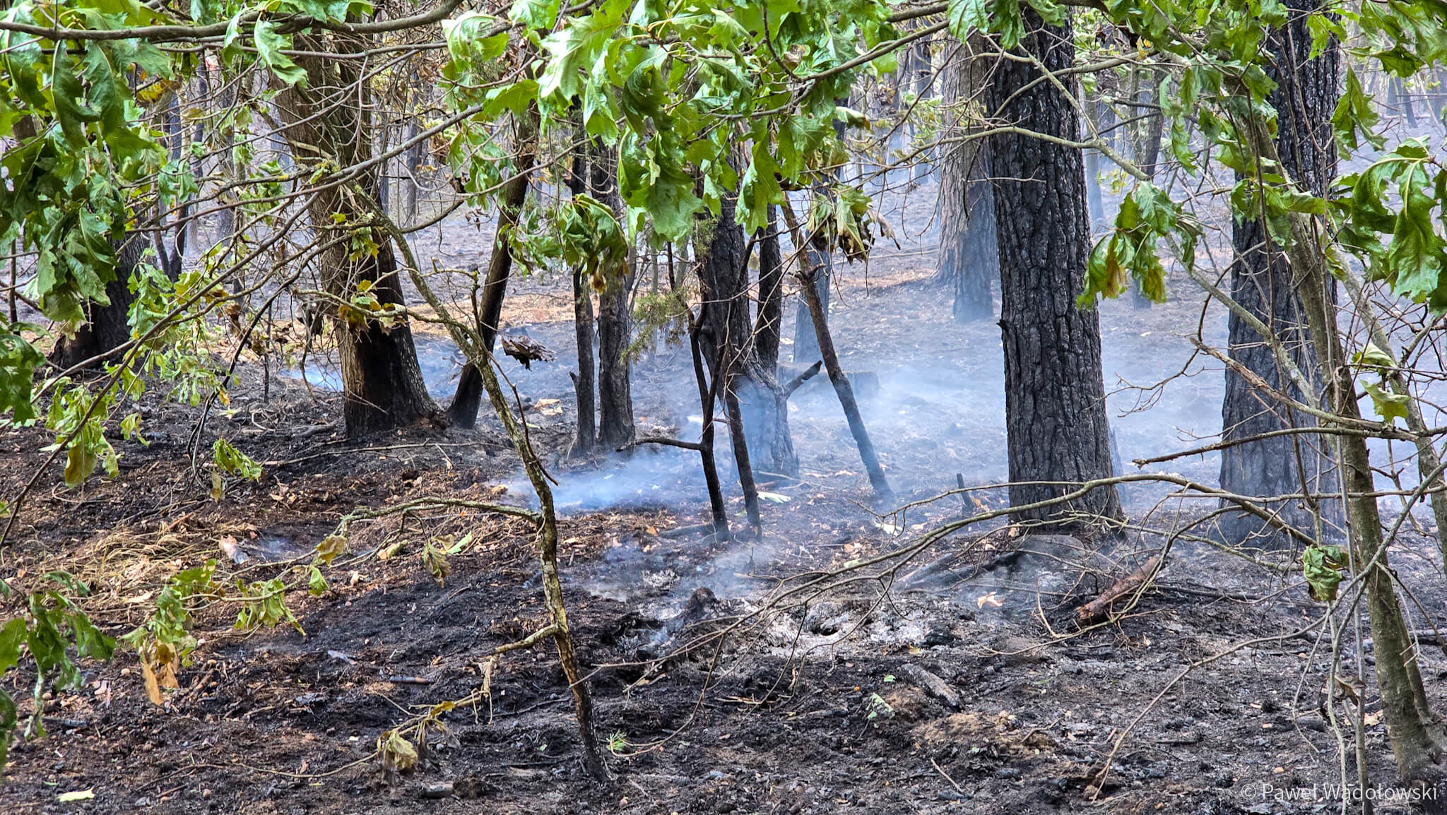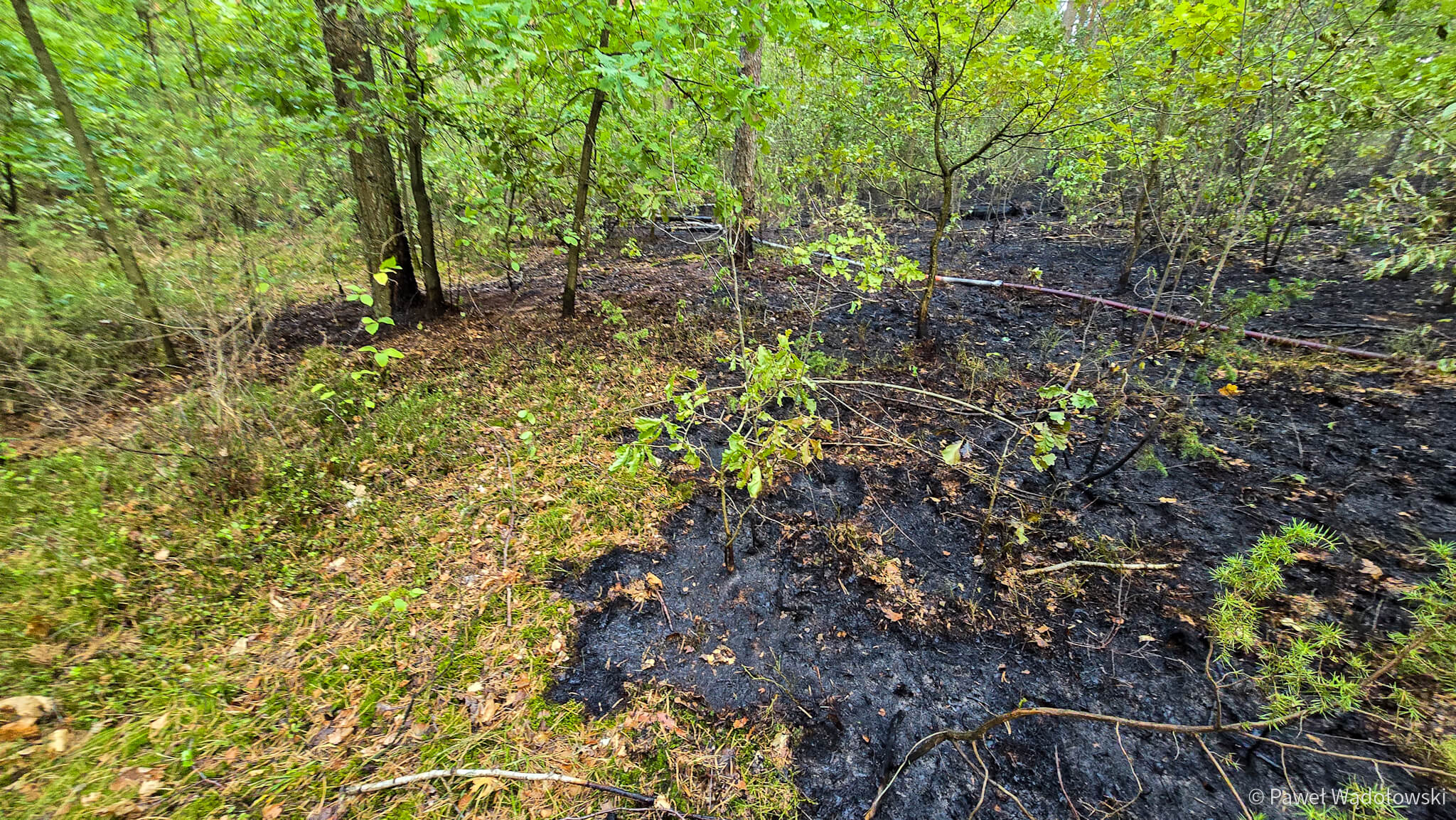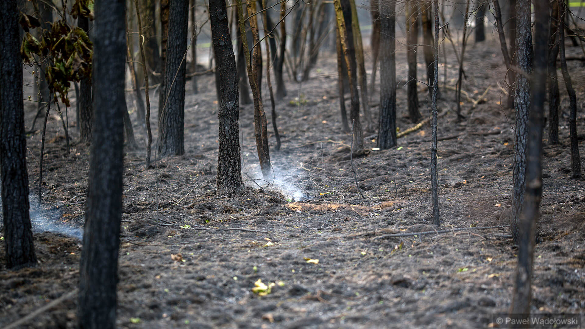 Część strażaków zostanie na pogorzelisku do rana. Muszą przelewać ściółkę, bo w wielu miejscach cały czas pojawia się ogień.