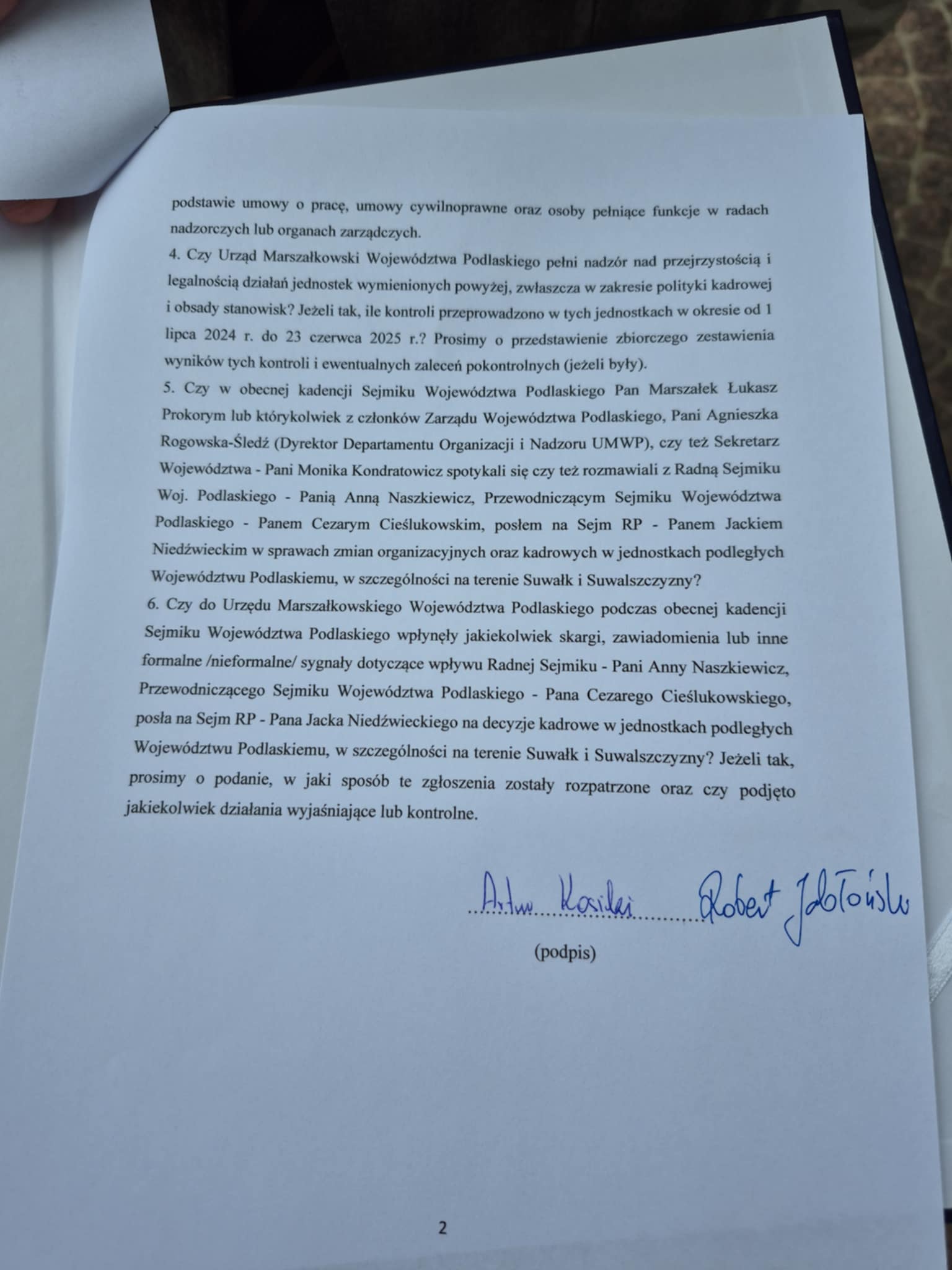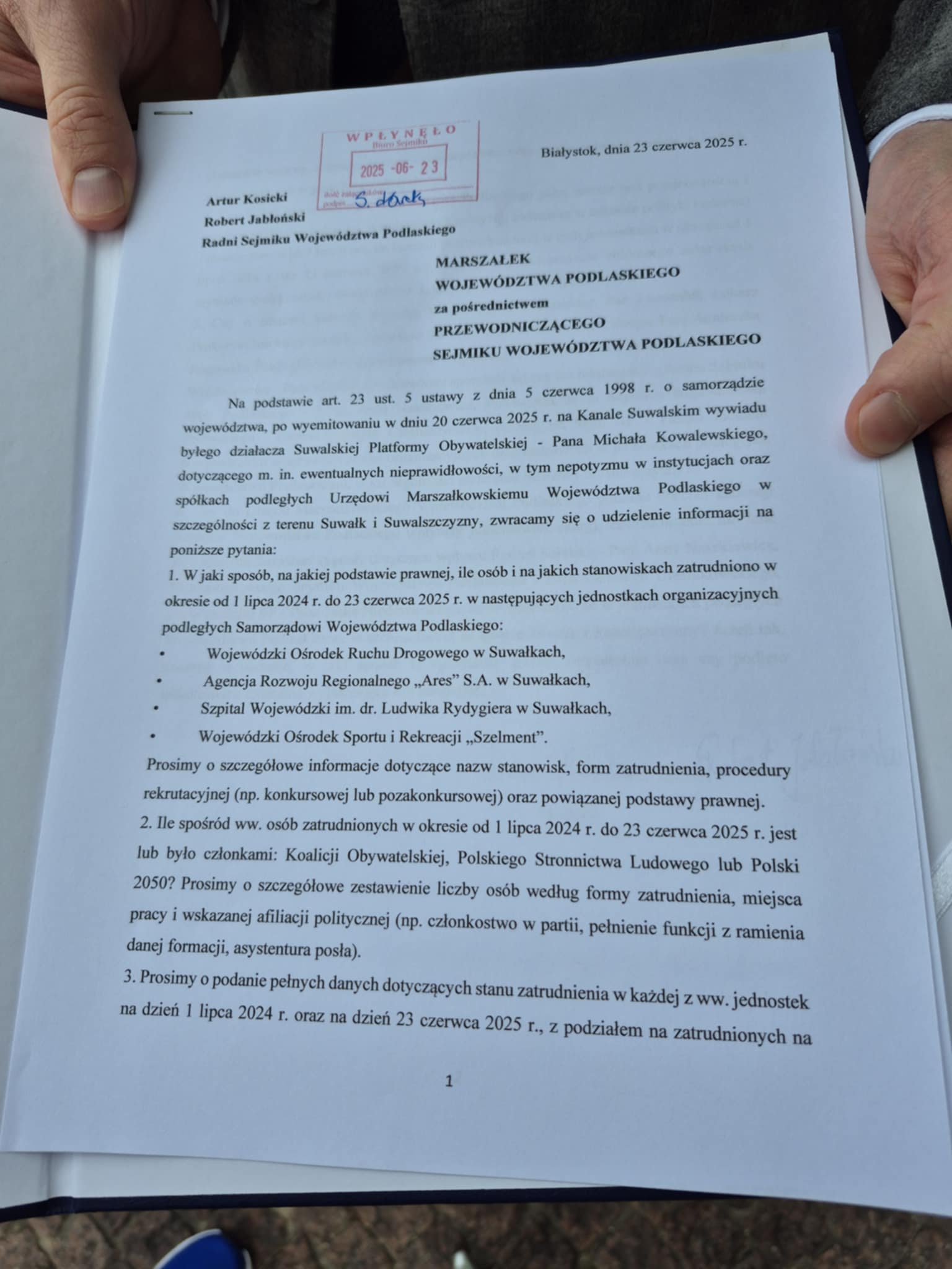Chcemy uzyskać informacje potwierdzające bądź zaprzeczające doniesieniom o nepotyzmie, który polega na rzekomym zatrudnianiu członków, działaczy Platformy Obywatelskiej bądź też ich krewnych w jednostkach organizacyjnych podległych Urzędowi Marszałkowskiemu Województwa Podlaskiego - mówi Artur Kosicki.