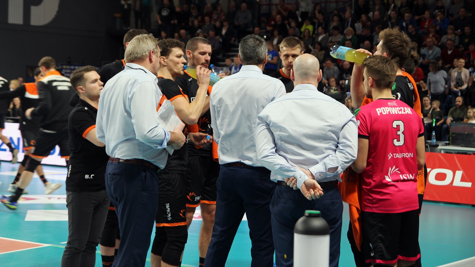 Jastrzębski Węgiel wychodzi w ustawieniu: Dawid Konarski, Julien Lyneel, Lukas Kampa, Jurij Gładyr, Tomasz Fornal, Graham Vigrass, na libero Jakub Popiwczak.