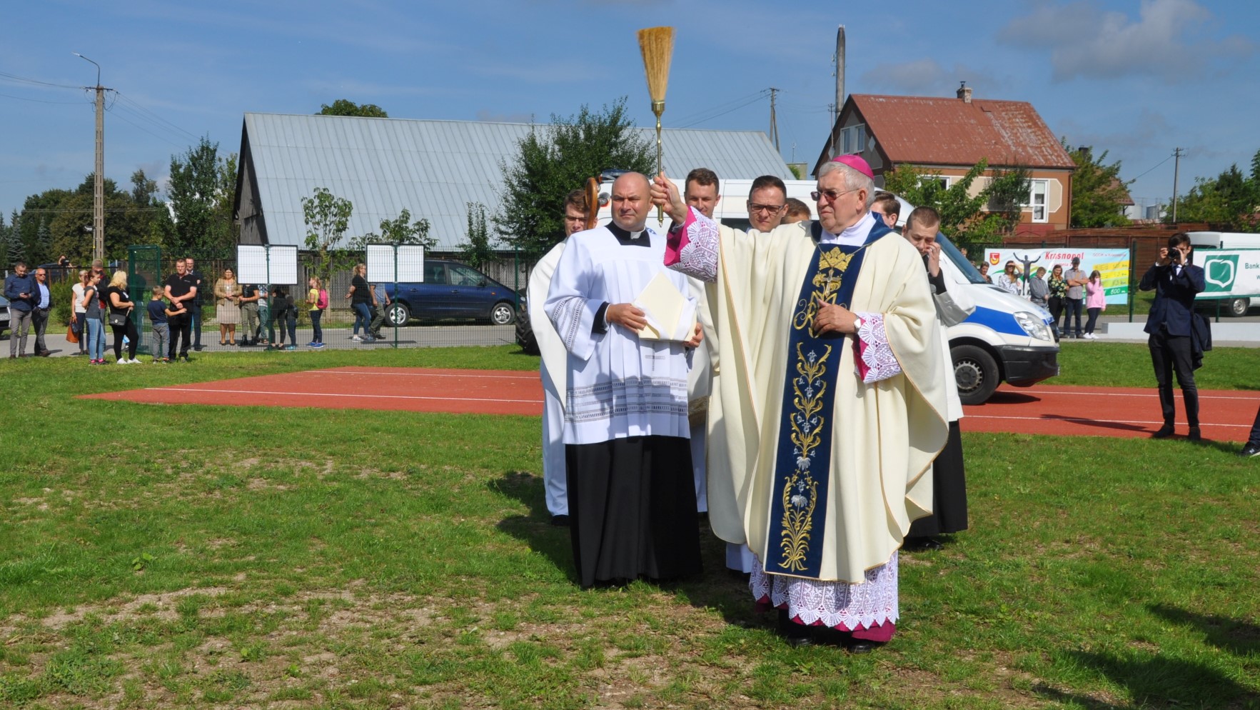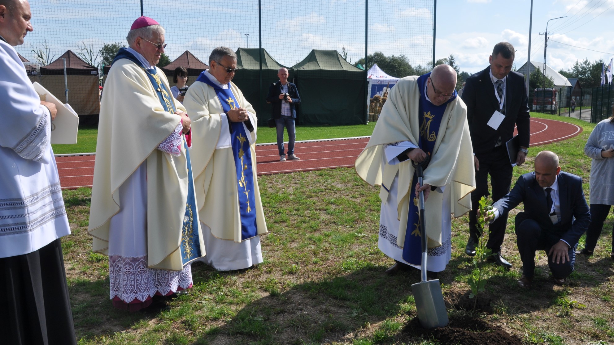 Symboliczne otwarcie boiska odbyło się w czasie sobotnich dożynek diecezjalnych. Obiekt poświęcił biskup ełcki Jerzy Mazur. Posadzono tam również dąb upamiętniający 250-lecie Krasnopola.