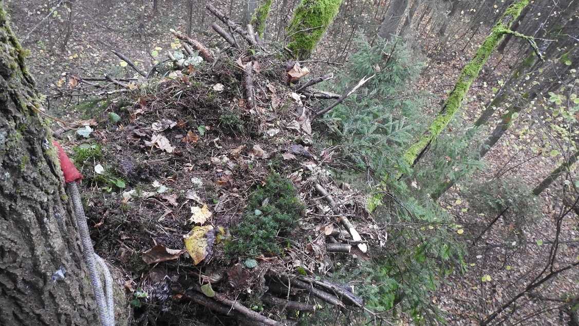 Podjęliśmy decyzję, że pomożemy w tych lęgach bociana czarnego. Jedno gniazdo mamy stwierdzone, niestety bez sukcesów, bo zostało zniszczone przez silny wiatr. Dlatego w tym miejscu wybudowaliśmy stabilną podstawę, żeby bocian czarny mógł na nią nanieść materiał gniazdowy, czyli jakieś gałęzie, i żeby to gniazdo nie było zagrożone upadkiem. Tu są bardzo dogodne miejsca dla tych ptaków, które rejestrujemy na naszych fotopułapkach.