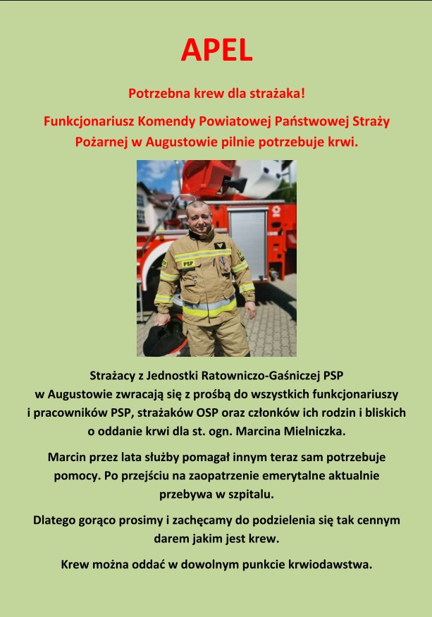 Ten funkcjonariusz odszedł już na zaopatrzenie emerytalne. A w ostatnich dniach doszła do nas wiadomość, że znajduje się w szpitalu i musi mieć przetłaczaną krew. Dlatego wystosowaliśmy apel do społeczeństwa, zaprzyjaźnionych służb i naszych strażaków. Chociaż w taki sposób próbujemy pomóc naszemu koledze.