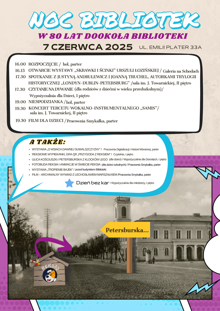 - Dla dzieci przygotowaliśmy teatrzyk kamishibai, różne aktywności naszej sowy oraz spotkanie z Reksiem — naszym suwalskim zwierzątkiem-symbolem. Zapraszamy do fotobudy Reksia oraz na animacje w jego świecie. Czekają również wypiekanki, gry z kodami QR i inne atrakcje – wszystko w ramach przygody z Reksiem. Na uczestników czekają specjalne nagrody ufundowane przez Urząd Miejski w Suwałkach. Zachęcamy zatem do udziału we wszystkich grach i zabawach.